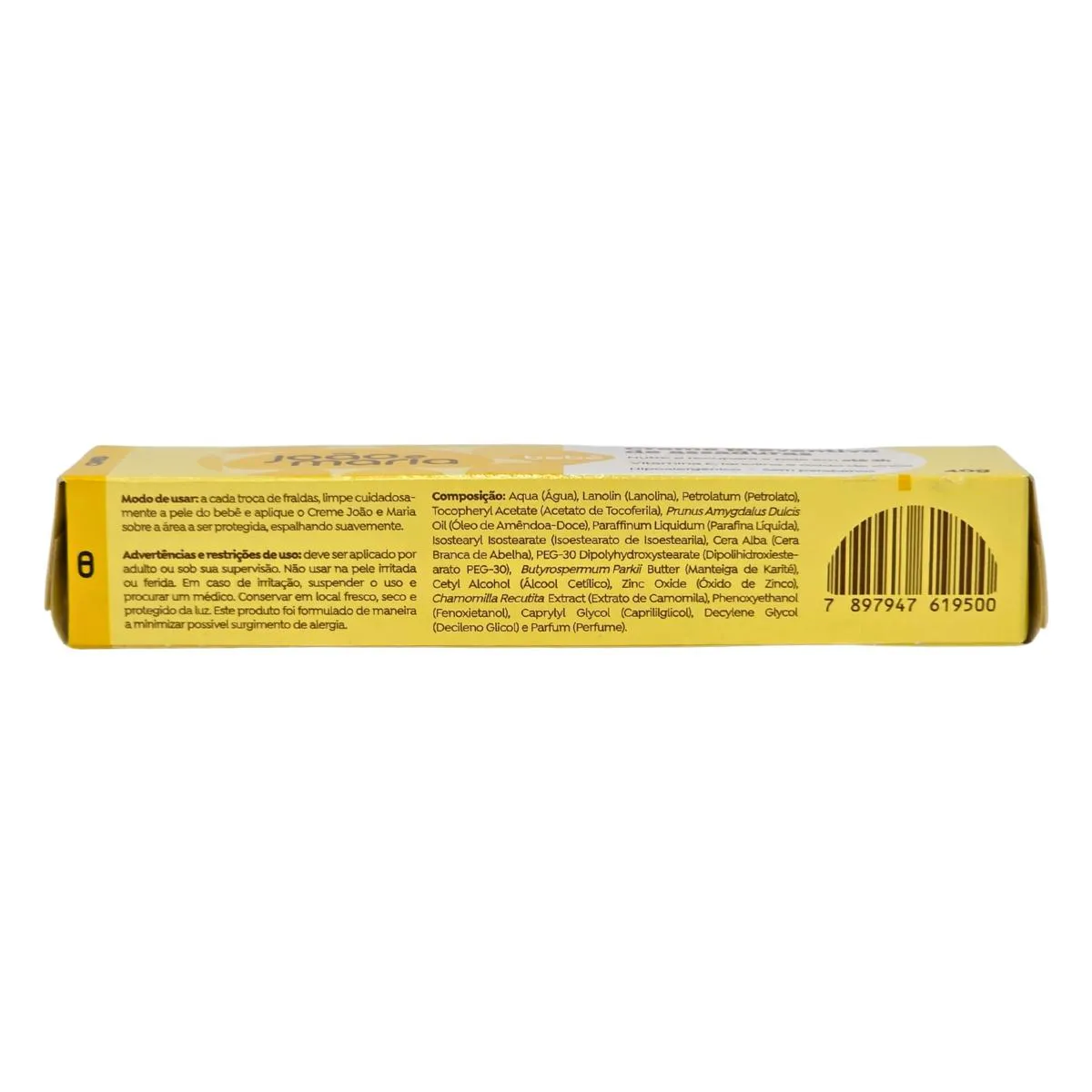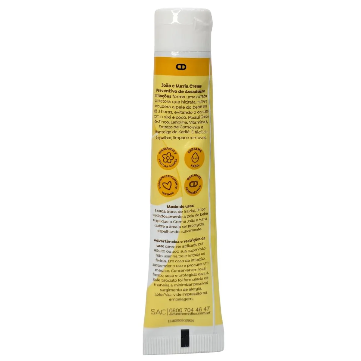 Finalidade: João e Maria Creme Preventivo de assadura e Irritações forma uma camada protetora que hidrata, nutre e recupera a pele do bebê em até 3 horas, evitando o contato com o xixi e cocô. Possui Óxido de Zinco, Lanolina, Vitamina E, Extrato de Camomila e Manteiga de Karité. É fácil de espalhar, limpar e remover.