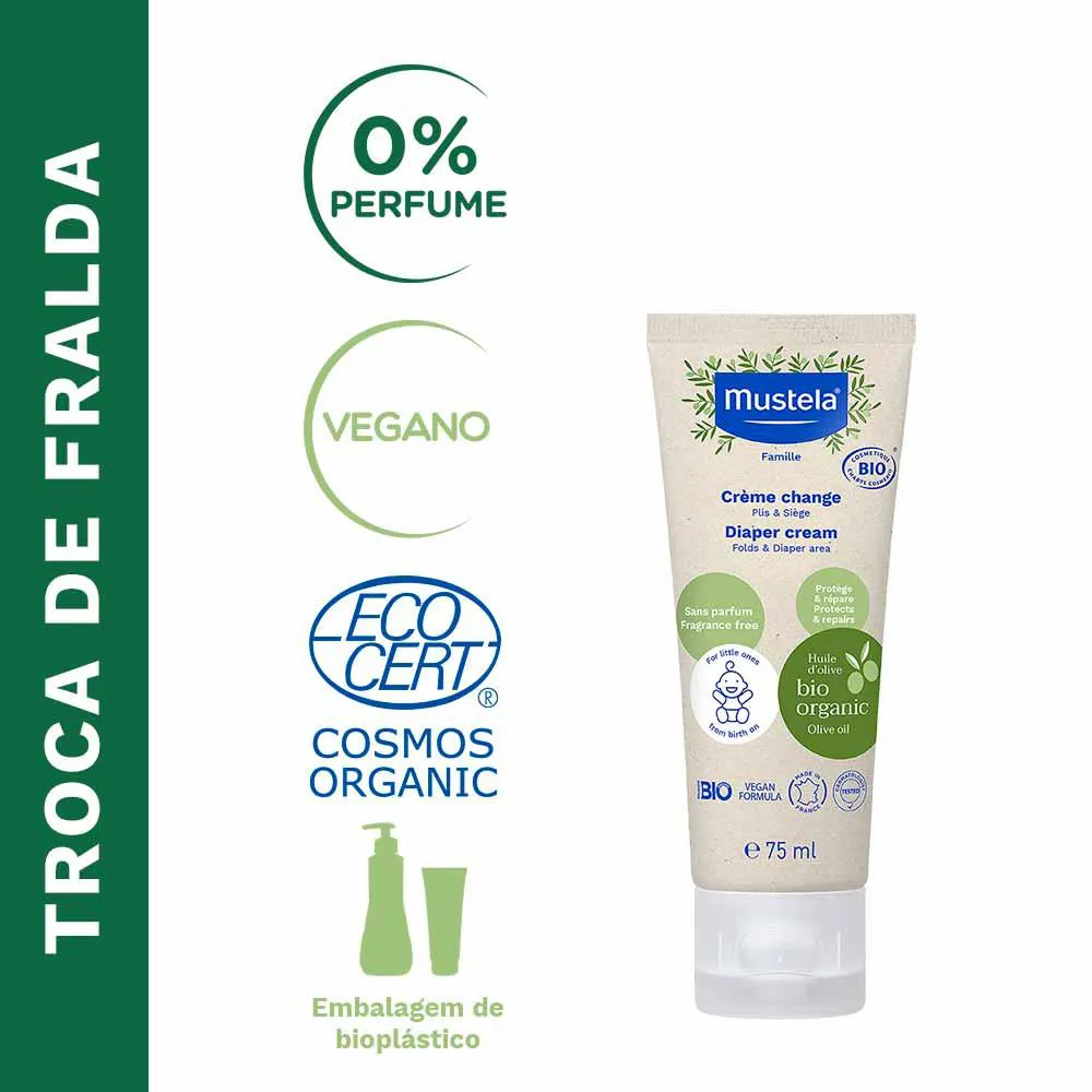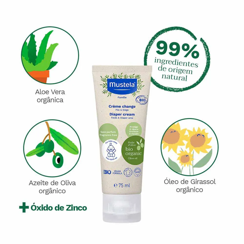 O Creme Preventivo de assaduras BIO 75 ml com Aloe Vera, Azeite de Oliva e Óleo de Girassol Orgânicos foi formulado para prevenir as assaduras e para ser usado diariamente. Hidrata e suaviza a pele delicada dos bebês, desde o nascimento. Sem perfume. Sua formulação com 50% do total de ingredientes provenientes da agricultura orgânica e 99% de ingredientes de origem natural, deixa uma película protetora, aliviando a vermelhidão. Propriedades: • Aloe Vera BIO: acalma e suaviza a pele. • Azeite de Oliva BIO: rico em ômega 6 e 9, com propriedades nutritivas para a pele. • Óleo de Girassol BIO: hidrata a pele. Para respeitar o meio ambiente, as pessoas e minimizar o seu impacto. O Creme Preventivo de Assaduras BIO possui fórmula vegana e sua embalagem é feita a partir da cana-de-açúcar. Conheça a linha completa Mustela BIO, feita para cuidar da pele de toda a família, desde o nascimento. Princípio Ativo: Aloe Vera BIO + Azeite de Oliva BIO + Óleo de Girassol BIO. Modo de Uso do Creme Preventivo de Assaduras BIO com Aloe Vera, Azeite de Oliva e Óleo de Girassol Orgânicos: Aplicar uma camada espessa no bumbum limpo e seco do bebê, a cada troca de fralda.