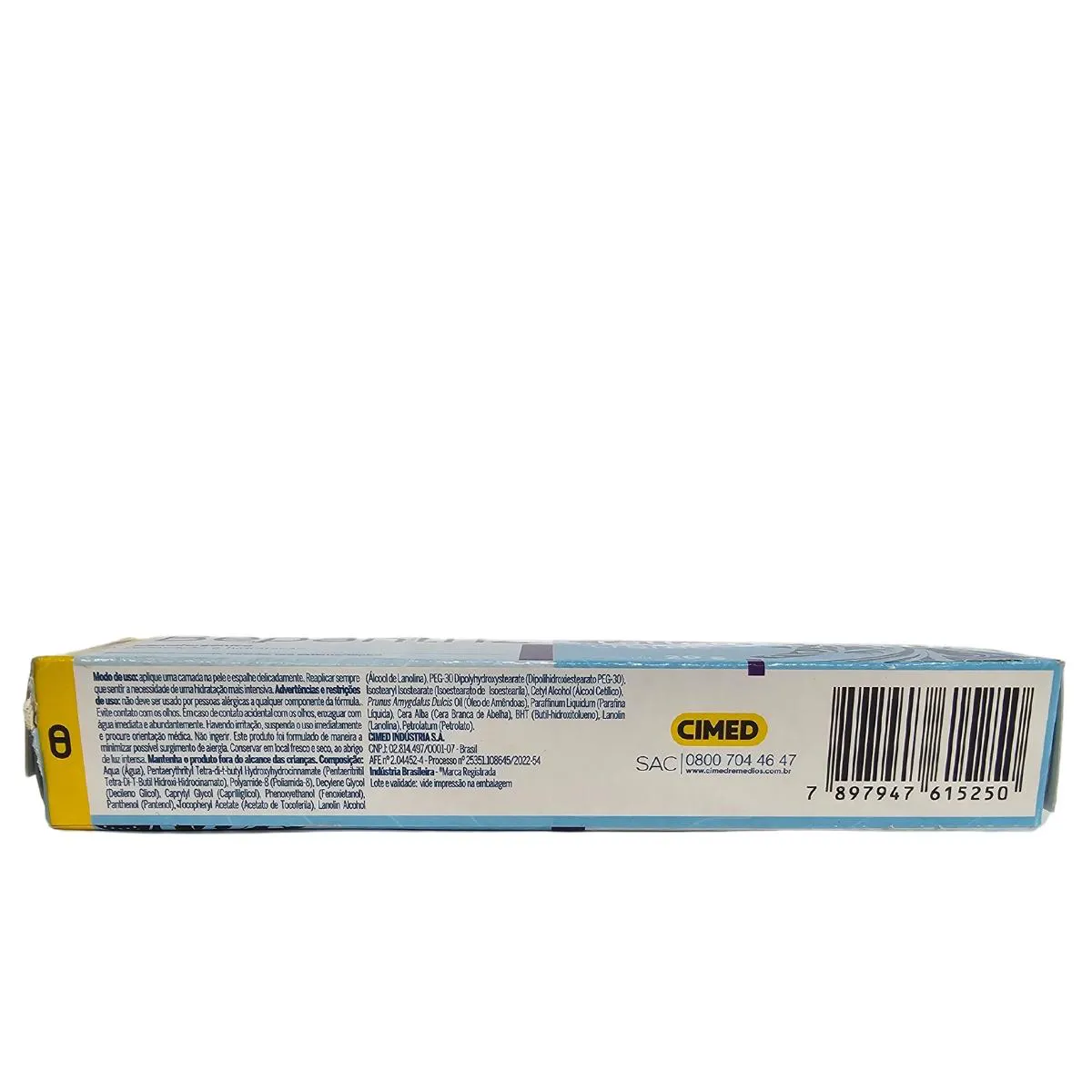 Composição: aqua (água), pentaerythrityl tetra-di-t-butyl hydroxyhydrocinnamate (pentaeritritil tetra-di-t-butil hidroxi-hidrocinamato), polyamide-8 (poliamida-8), decylene glycol (decileno glicol), caprylyl glycol (caprililglicol), phenoxyethanol (fenoxietanol), panthenol (pantenol), tocopheryl acetate (acetato de tocoferila), lanolin alcohol (álcool de lanolina), PEG-30 Dipolyhydroxystearate (dipolihidroxiestearato PEG-30), isostearyl isostearate (isoestearato de isoestearila), cetyl alcohol (álcool cetílico), prunus amygdalus dulcis oil (óleo de amêndoas), Paraffinum liquidum (parafina líquida), cera alba (cera branca de abelha), BHT (butil-hidrocitolueno), lanolin (lanolina), petrolatum (petrolato).