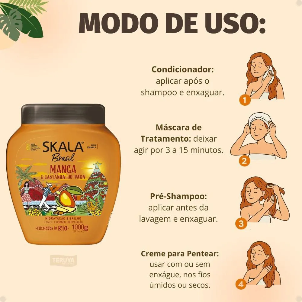 O Creme de Tratamento Skala Brasil Manga e Castanha do Pará oferece múltiplas formas de uso para se adaptar à sua rotina:Como Condicionador Tradicional: Aplique nos cabelos lavados, massageando mecha por mecha por todo o comprimento dos fios. Enxágue.Como Creme de Tratamento: Aplique no comprimento dos fios (evitando a raiz), deixe agir por 3 minutos. Enxágue. Para melhor resultado, use touca térmica/laminada por 15 minutos e enxágue.Como Pré-Shampoo: Com os cabelos sem lavar, divida mecha por mecha, aplique e enluve os fios, deixando agir. Enxágue e prossiga lavando com shampoo e condicionador. Para melhor resultado, use touca térmica/laminada por 15 minutos e enxágue.Como Co-Wash: Com os cabelos completamente molhados, coloque uma pequena quantidade nas palmas das mãos e distribua por todo o couro cabeludo. Massageie suavemente e enxágue. A seguir, adicione no comprimento e pontas, desembarace cuidadosamente os cabelos com o auxílio dos dedos e enxágue. Repita se necessário.Como Creme para Pentear (com enxágue): Aplique nos cabelos lavados com shampoo, massageando mecha por mecha por 3 minutos. Enxágue.Como Creme para Pentear (sem enxágue): Aplique uma pequena quantidade nos cabelos úmidos ou secos e espalhe bem. Não enxágue e penteie normalmente. A quantidade ideal dependerá da quantidade e comprimento dos fios.