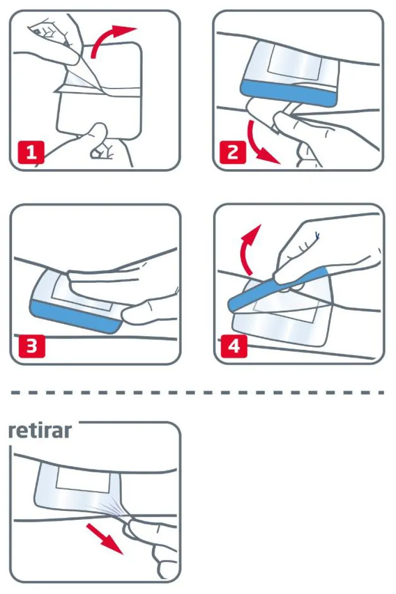 Aplicar a almofada absorvente sobre a ferida e fixar o filme transparente na pele.