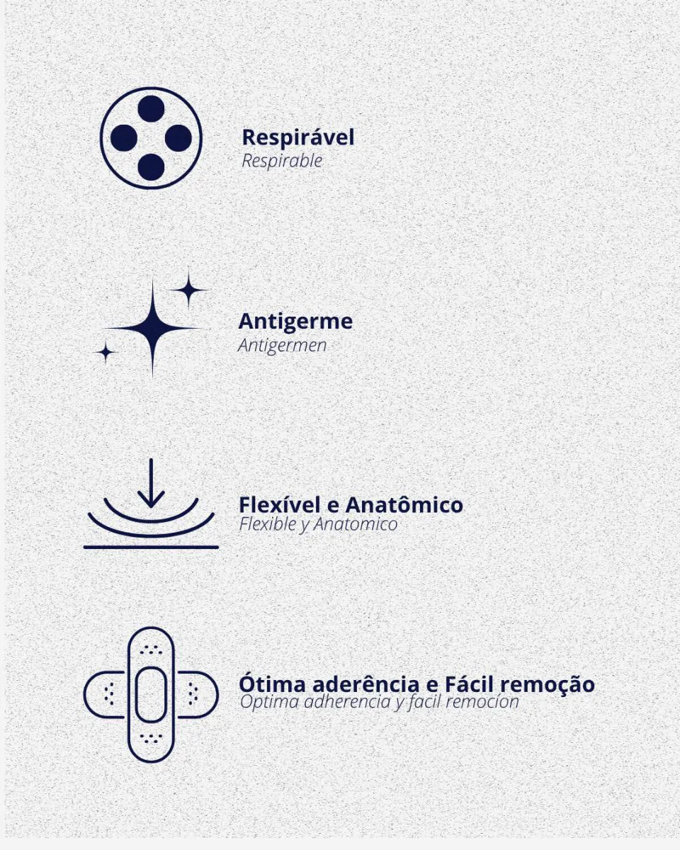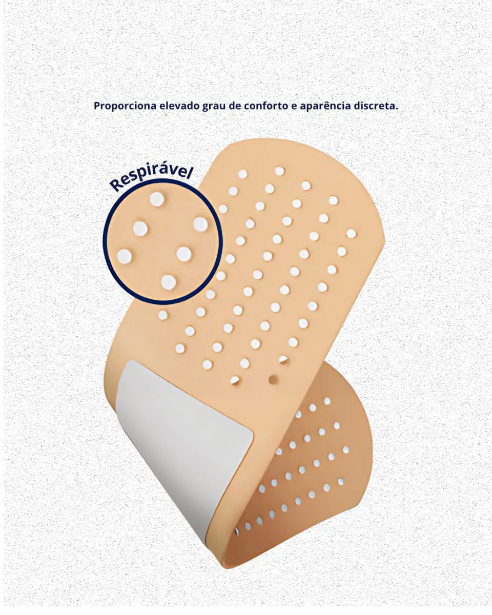 Produto flexível e anatômico. Possui ótima aderência com fácil remoção. Os curativos não aderem aos ferimentos proporcionando elevado grau de conforto e aparência discreta.