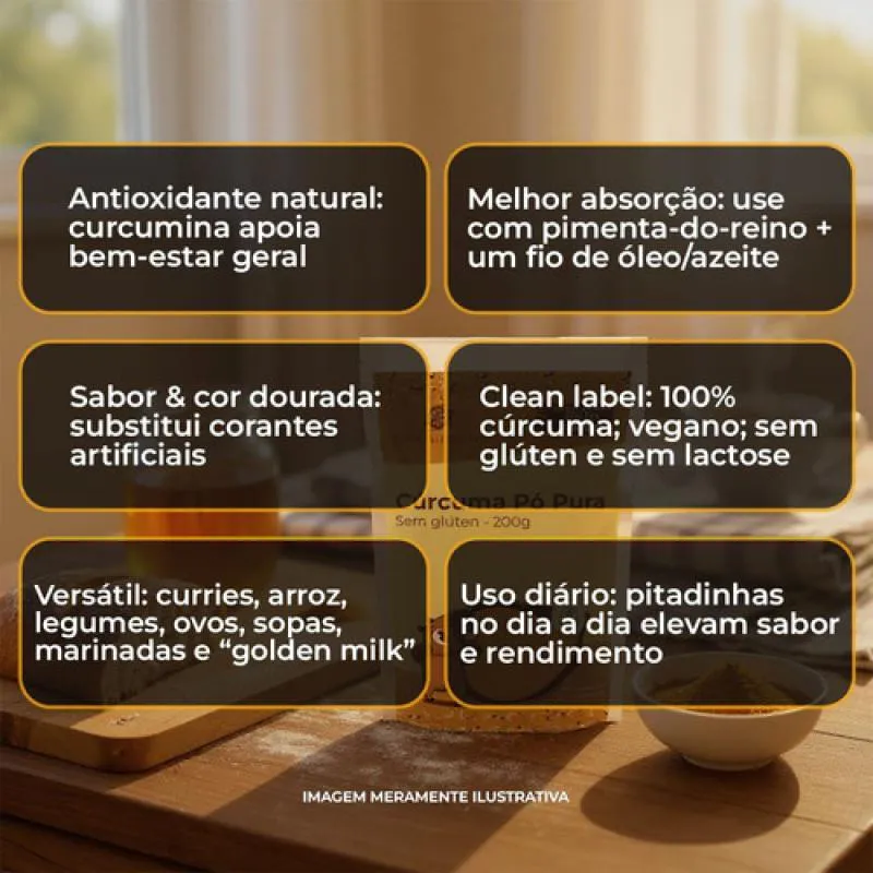 A cúrcuma é um condimento potente; use com moderação para evitar sabores exageradamente intensos. Armazene em local seco, fresco e protegido da luz para preservar aroma e propriedades.