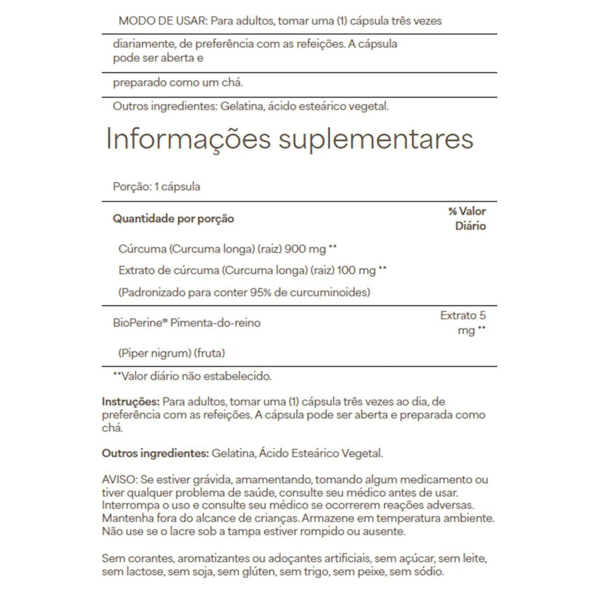 Ingredientes: Cúrcuma em pó, cápsula de gelatina, estearato de magnésio (lubrificante vegetal) e dióxido de silício (antiumectante).