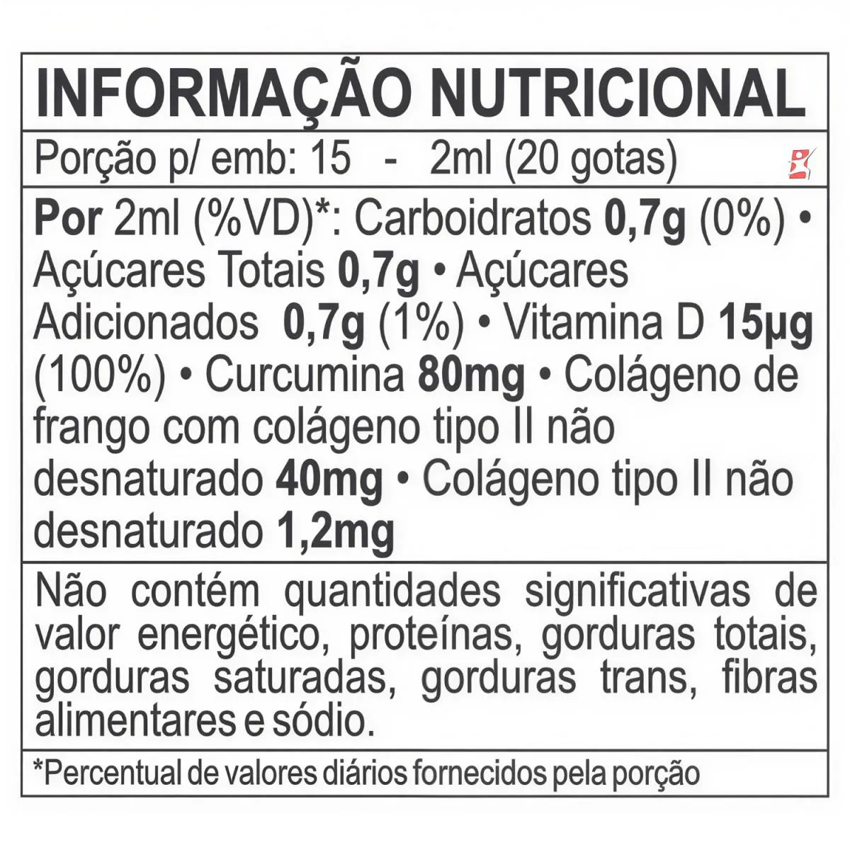 DESCRIÇÃO A cúrcuma longa é uma raiz que contem um molécula especial conhecida como curcumina. A curcumina é o princípio ativo que a ciência moderna destaca como um dos mais nobres compostos naturais benéficos para a saúde humana, uma dádiva com mais de 5.600 estudos científicos publicados. A vitamina d ajuda na formação de Ossos e Dentes, além de ajudar no funcionamento do sistema imune em geral. O colágeno TIPO 2 é uma proteína que tem em abundancia no corpo e é benéfica para a saúde. RECOMENDAÇÃO DE USO Ingerir 2ml (20 gotas) ao dia. AGITE ANTES DE USAR. TABELA NUTRICIONAL Anexo nas imagens do anúncio. COMPOSIÇÃO Água purificada, glucose de milho, extrato de rizomas de Curcuma longa, colágeno de frango com colágeno tipo II não desnaturado, colecalciferol, aromatizante óleo essencial de menta e conservante sorbato de potássio. NÃO CONTÉM GLÚTEN. CUIDADOS DE CONSERVAÇÃO - RECOMENDAÇÕES & CUIDADES Conservar ao abrigo da luz, calor e umidade. Após aberto consumir em até 60 dias. Produto indicado para o grupo populacional acima de 19 anos. Este produto não é um medicamento. Não exceder a recomendação diária de consumo indicada na embalagem. Mantenha fora do alcance de crianças. REGISTRO ANVISA Produto dispensado de registro conforme RDC 240/2018.