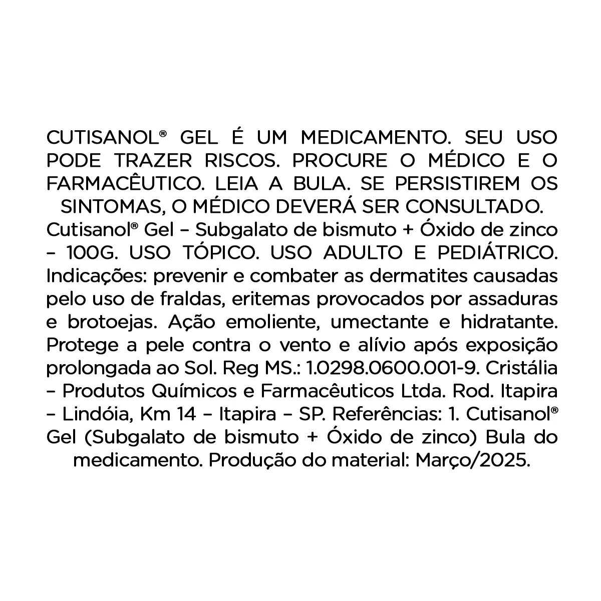 Cutisanol® Gel é um medicamento especialmente formulado para prevenir e combater as dermatites causadas pelo uso de fraldas e também eritemas provocados por assaduras e brotoejas. Possui ação emoliente, umectante e hidratante, deixando a pele macia e perfumada. O uso diário de Cutisanol® Gel ajuda a proteger a pele da ação do vento e proporciona sensação de frescor após exposição prolongada ao sol.