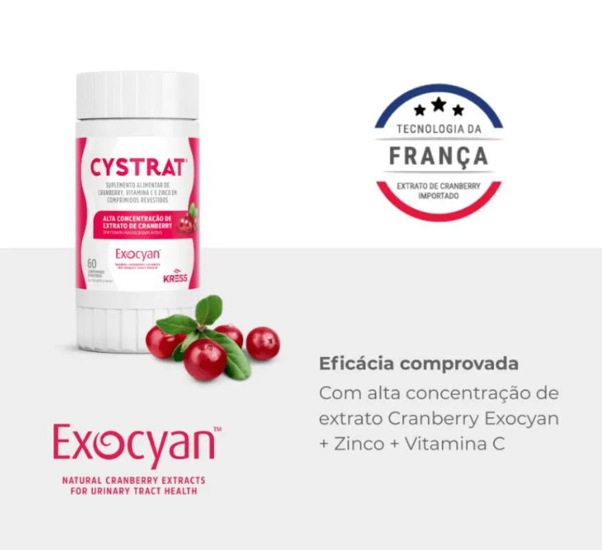 Cystrat tem eficácia comprovada e foi especialmente desenvolvido para auxiliar na prevenção e no tratamento de infecções urinárias. Possui alta concentração de extrato importado de Cranberry Exocyan + vitamina c e zinco.