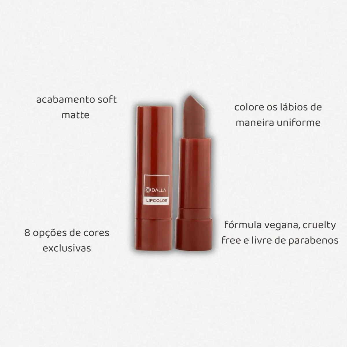 O batom Bastão Lipcolor da Dalla Makeup oferece cor intensa, textura macia e alta pigmentação desde a primeira aplicação. Sua fórmula cremosa desliza facilmente nos lábios, garantindo conforto ao longo do dia. Ideal para quem busca praticidade, acabamento impecável e longa duração. A cor é versátil e elegante, perfeita para destacar os lábios em qualquer ocasião, do dia a dia a eventos especiais.