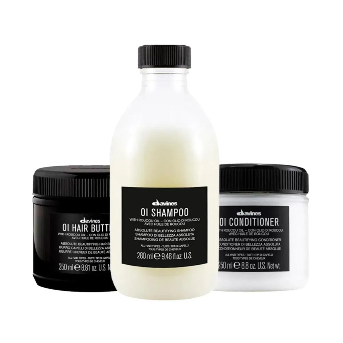 Descrição O Kit Davines Oi contém 1 Shampoo de 280 ml, 1 Condicionador de 250 ml e 1 Manteiga Nutritiva de 250 ml. O Shampoo oferece uma limpeza suave, delicada e tem ação oxidante e condicionante, aliado ao Condicionador que desembaraça e condiciona com suavidade e extrema maciez. A Máscara de Nutrição Davines OI Hair Butter, é uma manteiga capilar de nutrição profunda, promove brilho e maciez imediatos com efeito antifrizz. OI Hair Butter pode ser utilizada como pré e/ou pós shampoo, a depender da necessidade de cada fibra capilar. Ideal para cabelos mais ressecados e/ou grossos. Kit para todos os tipos de cabelos. Este kit Davines Oi une proteção contra os daNos causados por altas temperaturas de calor, protege a estrutura capilar, ao mesmo tempo que proporciona brilho e deixa os cabelos perfumados por muito mais tempo. A linha OI é best-seller e queridinha de Davines, tem fórmula enriquecida com óleo de Urucum e blend de óleos de última geração que protege a estrutura do fio. Dedicada à beleza absoluta de todos os tipos de