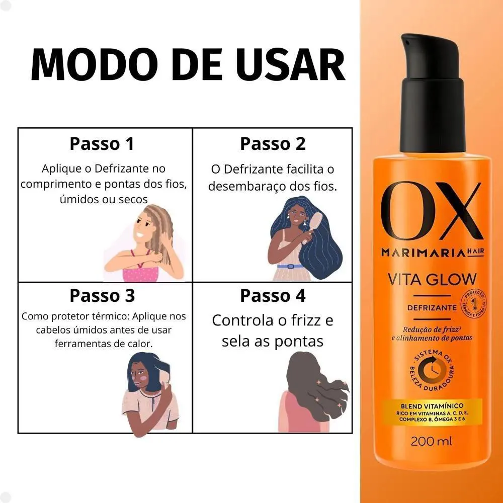 Defrizante Mari Maria Hair Vita Glow A Linha OX MARI MARIA HAIR VITA GLOW é a ideal para cabelos ressecados e enfraquecidos. Isso porque o blend de óleos com alto poder vitaminico é rico em VITAMINAS A, C, D, E, COMPLEXO B, ÔMEGA 3 E 6. É a fórmula certa para nutrir os fios auxiliando no crescimento saudável dos cabelos. Tratamento prolongado aos fios. O Defrizante reduz o frizz e alinha as pontas. Com proteção térmica e Filtro UV. . Modo de Uso Aplique o Defrizante no comprimento e pontas dos fios, úmidos ou secos para realizar o controle do frizz e selamento de pontas. Pode ser utilizado como protetor térmico antes de ferramentas de calor. . Composição ÁGUA; ESTEARATO DE OCTILA; ÁLCOOL CETÍLICO; CLORETO DE BEENTRIMÔNIO; BIS-CETEARYL AMODIMETHICONE; PERFUME; ÁLCOOL CETEARÍLICO; FOSFATO DE AMIDO HIDROXIPROPÍLICO; CLORETO DE CETRIMÔNIO; FENOXIETANOL; ÁLCOOL ISOPROPÍLICO; CAPRILILGLICOL; EDETATO DISSÓDICO; POLIQUATÉRNIO-55; GLICEROL; CETEARETE-7; CETEARETE-25; ISOPROPALAMINA; ÁCIDO LÁCTICO; OCTINOXATO; ÓLEO DA SEMENTE DE GIRASSOL; AMILOPECTINA; PROTEÍNA DE TRIGO HIDROLISADA; ÓLEO DE ABACATE; AMIDO DE MILHO; ÓLEO DE COCO; ÓLEO DA SEMENTE DE LINHAÇA; ÓLEO DA CASTANHA DE ARGAN; ÓLEO DA SEMENTE DE MACADAMIA TERNIFOLIA; ÓLEO DO FRUTO DE OLIVEIRA; EXTRATO DA CULTURA DO CALO DE LARANJA DOCE; PANTENOL; EXTRATO DE ALGA LITHOTHAMNION CALCAREUM; BIOTINA; CITRAL; CITRONELOL; CUMARINA; GERANIOL; HEXIL CINAMAL; DEXTROLIMONENO; LINALOL. . Código de Registro Sanitário (ANVISA) 25351.363385/2024-40
