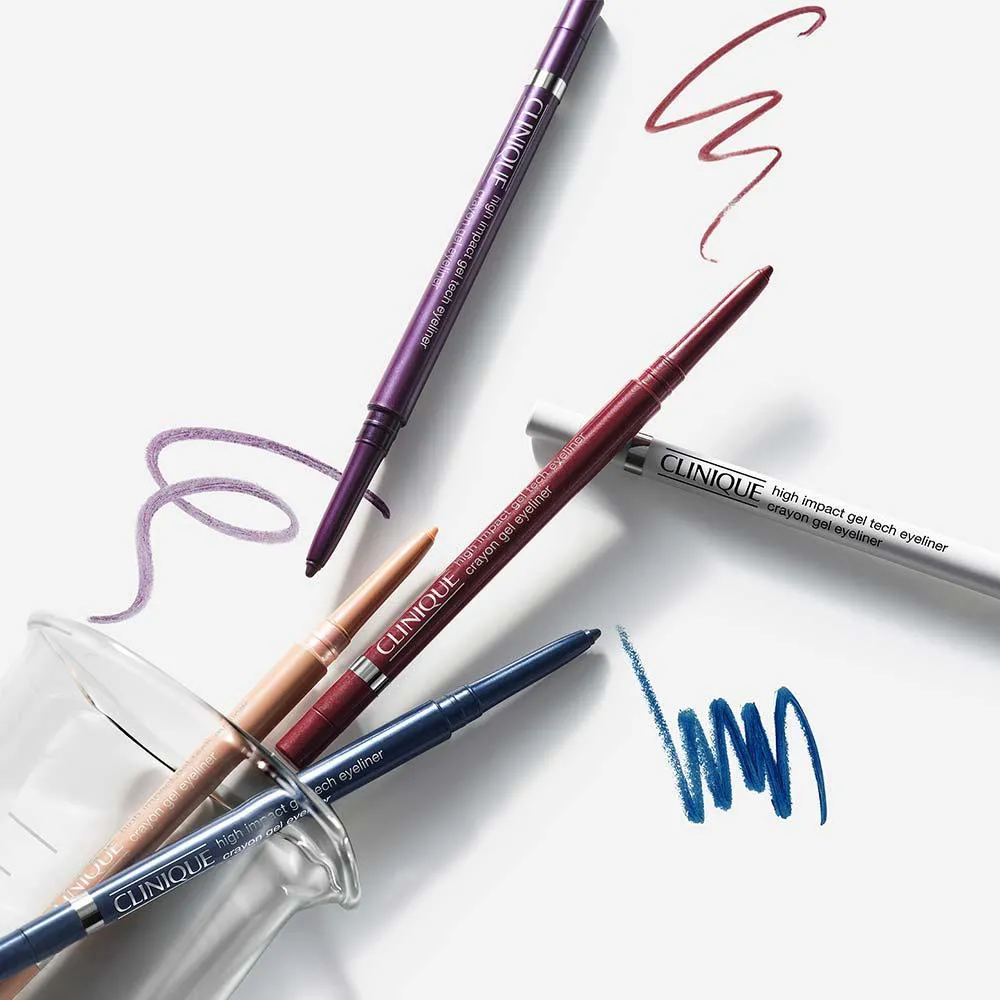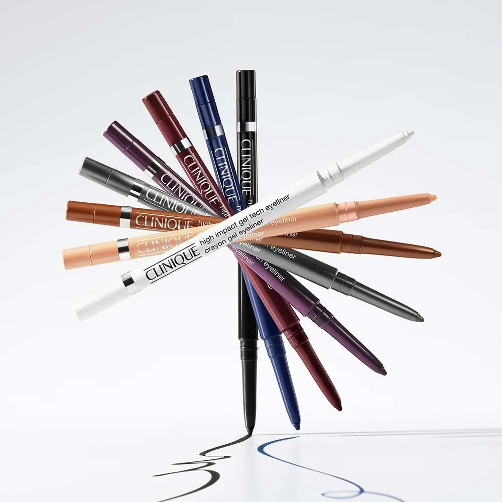O Delineador em Gel Clinique Tech High Impact ultrapigmentado desliza suavemente e permanece firme. 24 horas de uso nas pálpebras, 12 horas de uso na linha d’água.