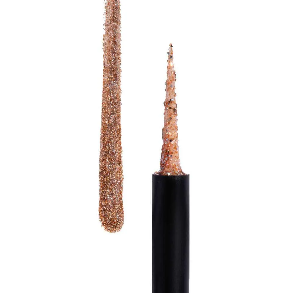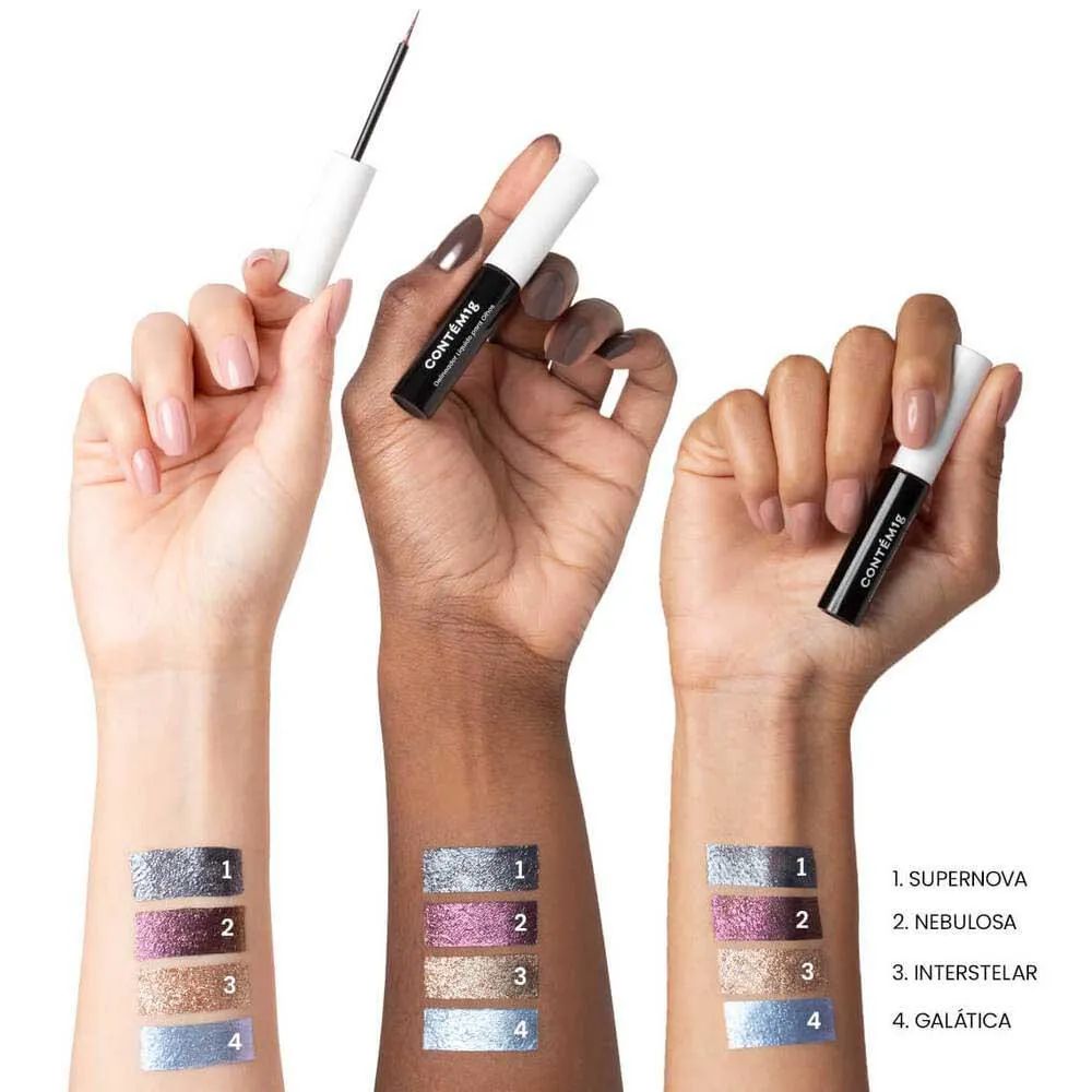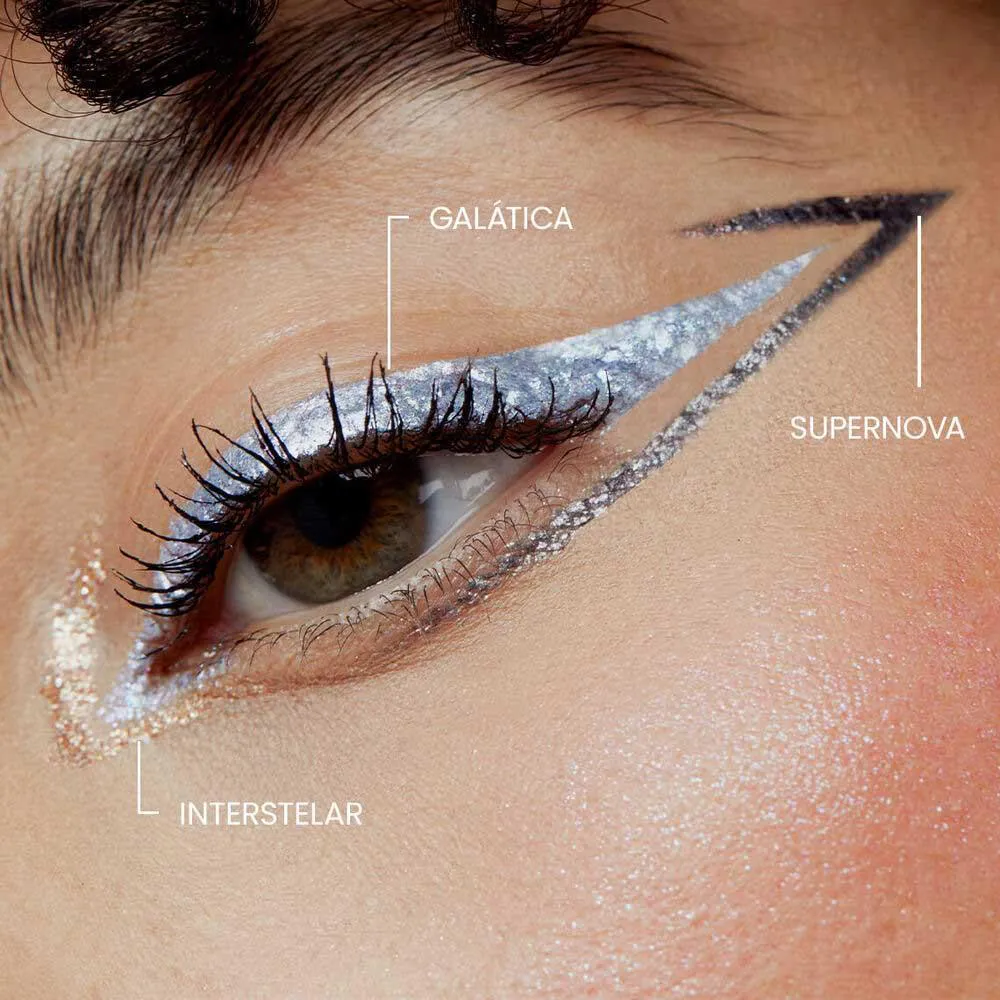 Um delineador que vai injetar um toque de brilho inesperado e extraordinário no seu look. Com ponta fina em 4 cores super hipnóticas, hiperpigmentadas e com partículas de glitter, ele entrega um efeito brilhante, reflexivo e cintilante. À base d’água, sua fórmula contém pérolas micro refletoras que criam um efeito 3D. De excelente fixação e textura fina que não transfere, o delineador tem duração de até 12 horas para você se jogar com tudo nos looks mais criativos. Disponível em quatro cores cósmicas: Interestelar, Galáctica, Nébula e Supernova.