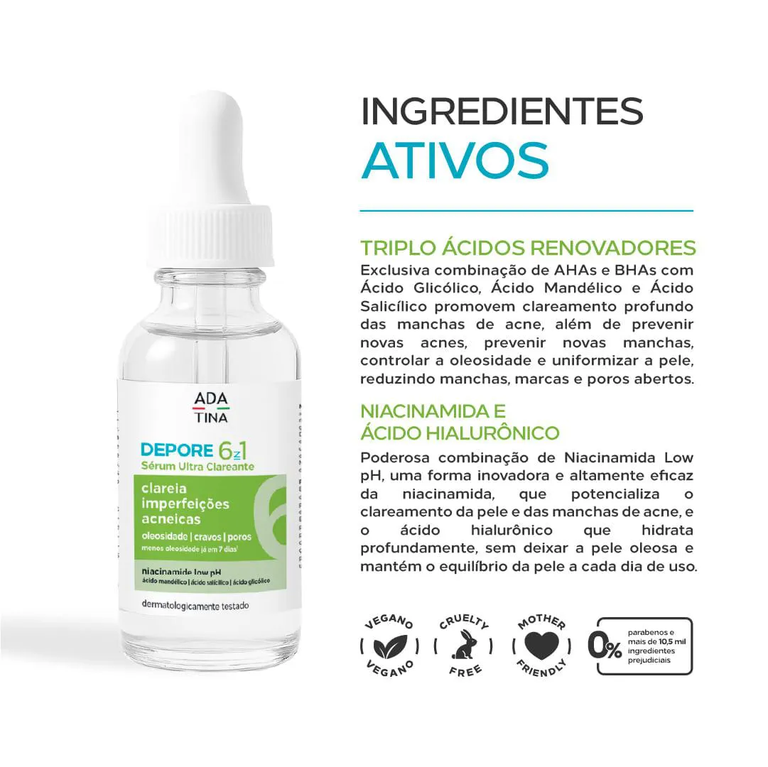 Depore 6 in 1 Sérum Ultra Clareante é um sérum dermatológico de alta potência, desenvolvido especialmente para peles com manchas deixadas pela acne, peles oleosas e com acne, manchas escuras e cravos, que entrega 6 vezes mais clareamento com eficácia visível desde a 1ª aplicação.