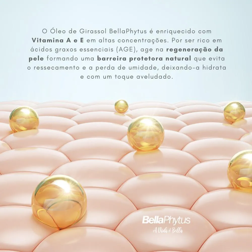 Óleo de Girassol, enriquecido com vitamina a e E em altas concentrações. Por ser rico em ácidos graxos essenciais (AGE), age na regeneração da pele formando uma barreira protetora natural que evita o ressecamento, deixando-a hidrata e com toque aveludado.Benefícios