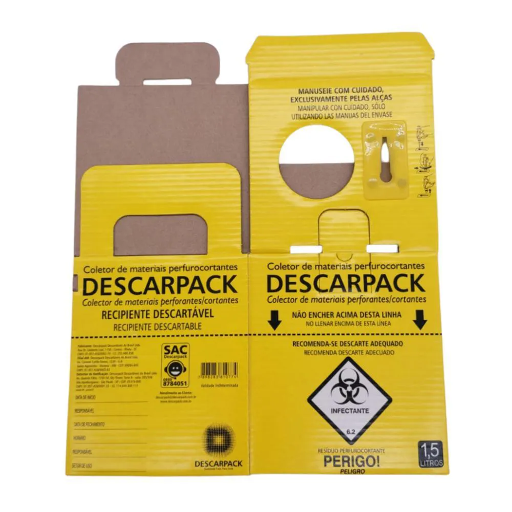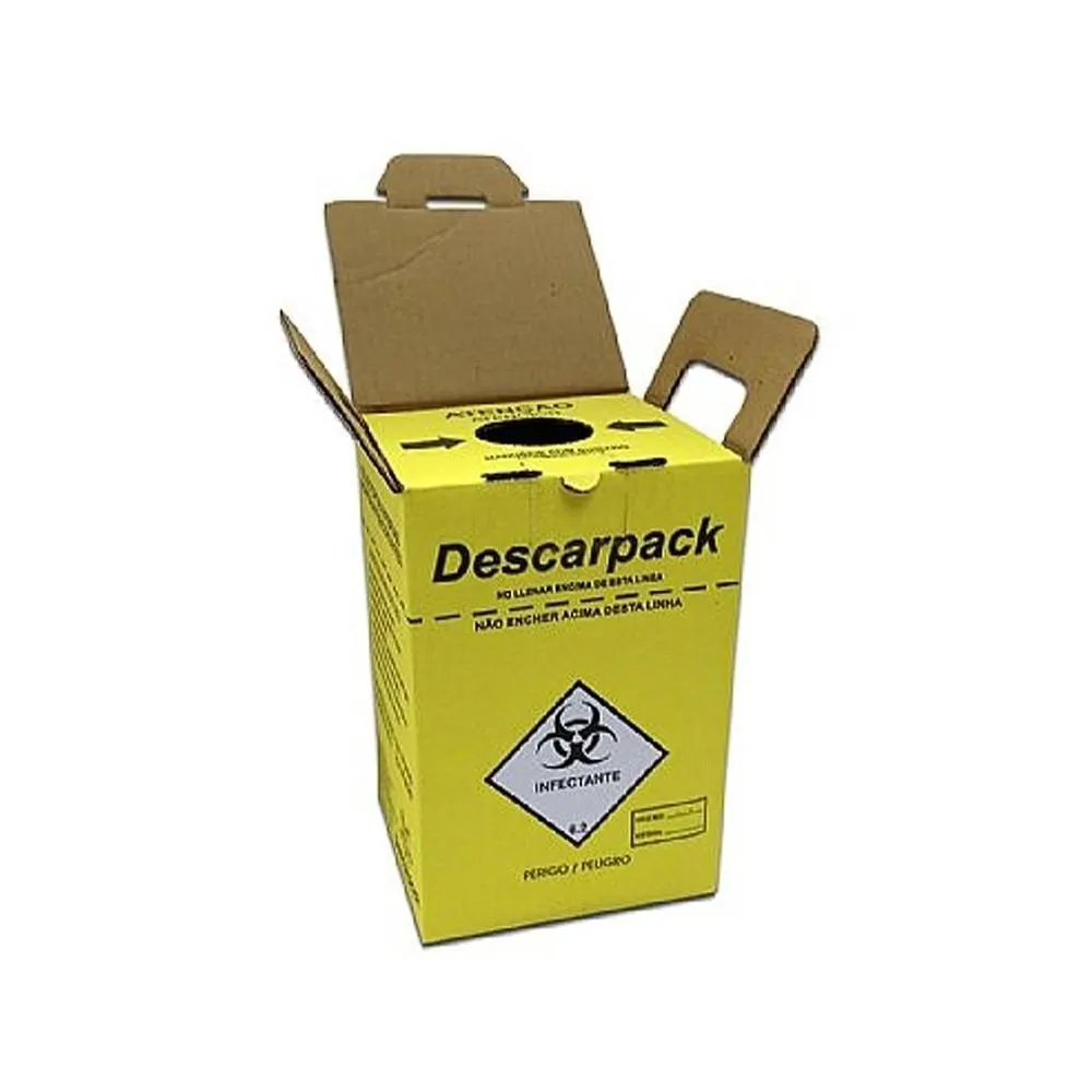 DESCARPACK 7 LITROS Coletor de Materiais Perfuro Cortantes Instruções de Uso: - Preencher somente até a linha pontilhada; - Não manuseie, reencape ou entorte as agulhas usadas - Não desconecte a agulha da seringa: descarte o conjunto completo; - Durante o transporte mantenha o coletor afastado do corpo.