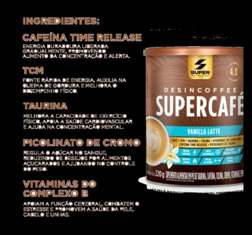 Desincoffee Supercafé é uma bebida revolucionária à base de café com mais ingredientes incríveis, totalmente diferente de tudo que você já provou. Combina ingredientes premium em uma formulação exclusiva. Possui 100mg de cafeína por porção que auxilia no aumento do estado de alerta e na melhora da concentração. Permite fazer o que te move, e ir além. Tudo isso com muito, muito sabor e baixo em calorias. Como você nunca viu em um café bulletproof. Experimente o café com chocolate que vai despertar o melhor de suas várias versões.