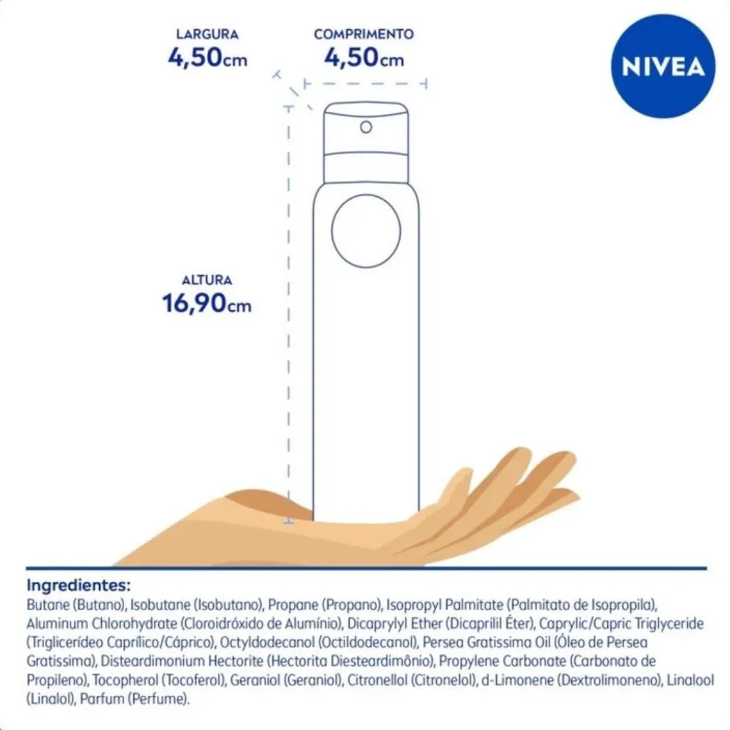 DESODORANTE AERO NIVEA 150ML FEM FRESH SENSATION - KIT C/ 2UN Descrição O Desodorante Aero Nivea Fresh Sensation, em embalagem de 150ml, oferece proteção eficaz contra o odor e a transpiração, mantendo você fresca e confiante ao longo do dia. Sua fórmula suave e refrescante proporciona uma sensação de conforto e bem-estar, enquanto sua fragrância delicada deixa a pele levemente perfumada. Este desodorante em aerossol é de fácil aplicação e rápida secagem, sendo ideal para uso diário. Modo de Uso Agite bem antes de usar. Mantenha o frasco na posição vertical e aplique o desodorante a uma distância de aproximadamente 15 cm das axilas. Espere alguns segundos até secar antes de se vestir. Reaplique ao longo do dia, conforme necessário, para manter a proteção e a sensação de frescor. Evite o contato com os olhos e não aplique em pele irritada ou lesionada.