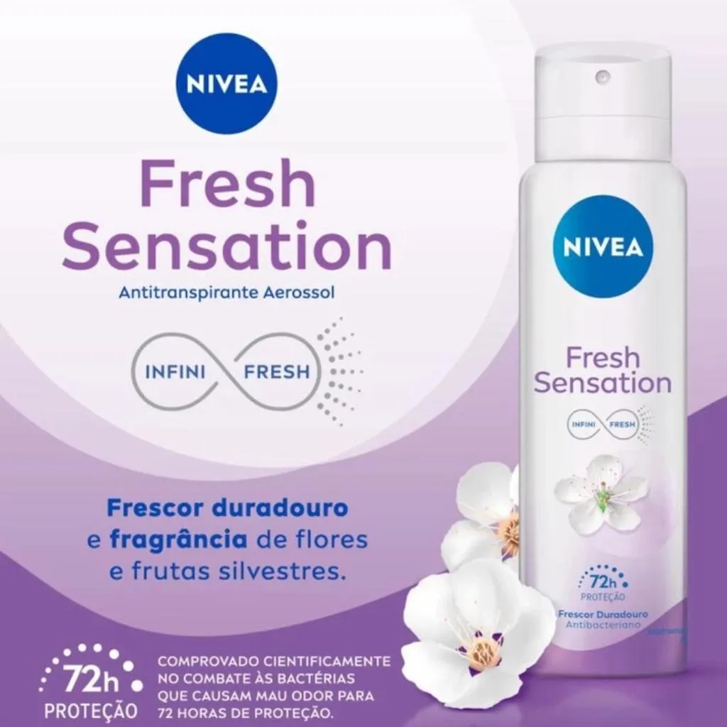 DESODORANTE AERO NIVEA 150ML FEM FRESH SENSATION - KIT C/ 4UN Descrição O Desodorante Aero Nivea Fresh Sensation, em embalagem de 150ml, oferece proteção eficaz contra o odor e a transpiração, mantendo você fresca e confiante ao longo do dia. Sua fórmula suave e refrescante proporciona uma sensação de conforto e bem-estar, enquanto sua fragrância delicada deixa a pele levemente perfumada. Este desodorante em aerossol é de fácil aplicação e rápida secagem, sendo ideal para uso diário. Modo de Uso Agite bem antes de usar. Mantenha o frasco na posição vertical e aplique o desodorante a uma distância de aproximadamente 15 cm das axilas. Espere alguns segundos até secar antes de se vestir. Reaplique ao longo do dia, conforme necessário, para manter a proteção e a sensação de frescor. Evite o contato com os olhos e não aplique em pele irritada ou lesionada.