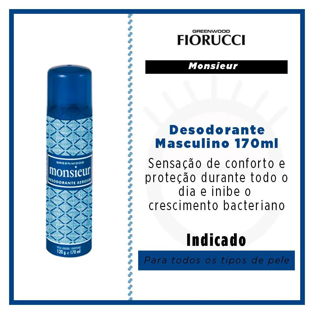 O Desodorante aerosol Monsieur de Fiorucci possui uma fórmula especialmente desenvolvida com padrões internacionais e dermatologicamente testada que garante proteção e uma pele fresca e protegida.