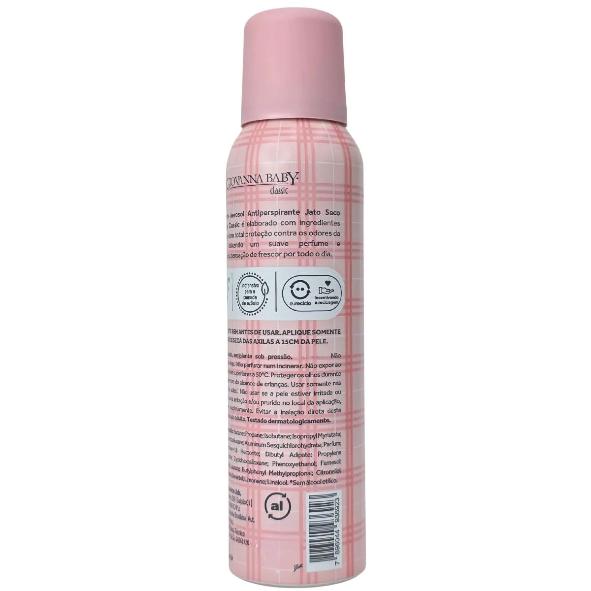 Finalidade: O Desodorante Aerossol Antiperspirante Jato Seco Giovanna Baby Classic é elaborado com ingredientes ativos que garantem total proteção contra os odores da transpiração, deixando um suave perfume e promovendo uma sensação de frescor por todo o dia.
