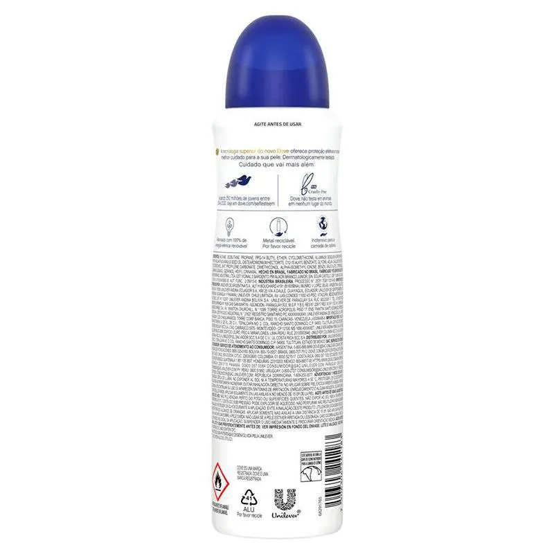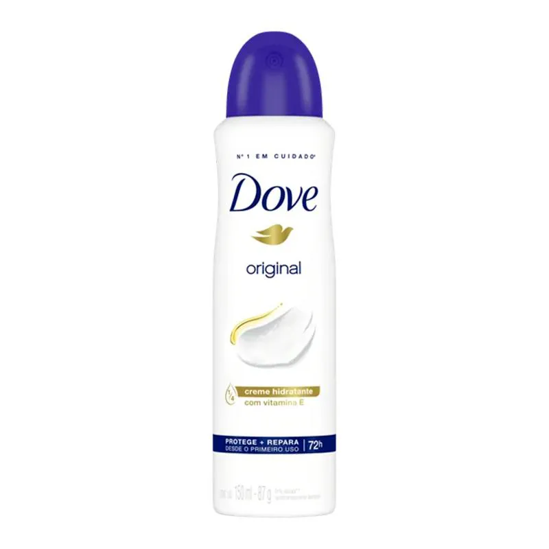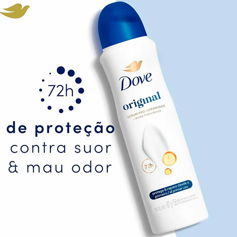 O Dove Original Aerosol foi desenvolvido para oferecer máxima proteção contra suor e mau odor, ao mesmo tempo em que cuida da pele das axilas. Sua fórmula contém ¼ de creme hidratante enriquecido com vitamina e, ajudando a manter a pele macia, suave e hidratada desde o primeiro uso, ideal para pré e pós-depilação.