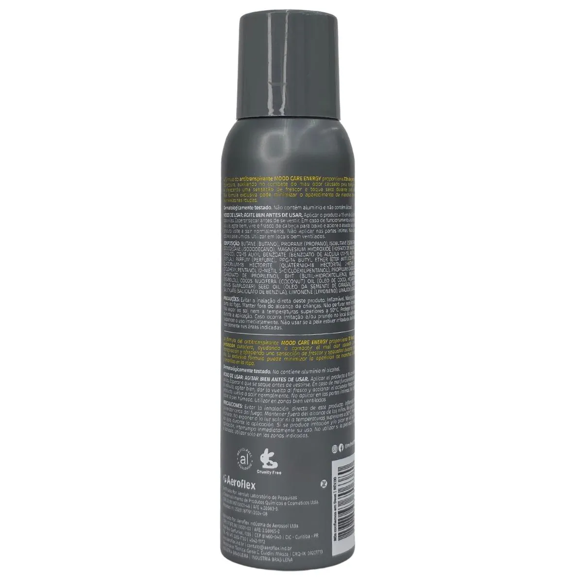 Composição: Butane(butano), propane (propano), isobutano (isobutano), isododecane (isododecano), magnesium Hydroxide (fosfato de magnésio dibásico), C12-C15 alkyl benzoate (benzoato de alquila C12-C15), methylal (metilal), parfum (perfume), PPG-14 butil ether (éter butílico PPG-14), quaternium-18 hectorite (quaternio-18 hectorita), 2-methyl 5-cyclohexylpentanol (2-metil 5-cicloexilpentanol), propylene carbonate (carbonato de propileno), bht (butil-hidroxitolueno), bisabolol (bisabolol), cocos nucifera (coconut) oil ( óleo de coco), helianthus annus (sunflower) seed oil (óleo da semente de girassol), benzyl salicylate (salicilato de benzila), limonene (limoneno), linalool (linalol).