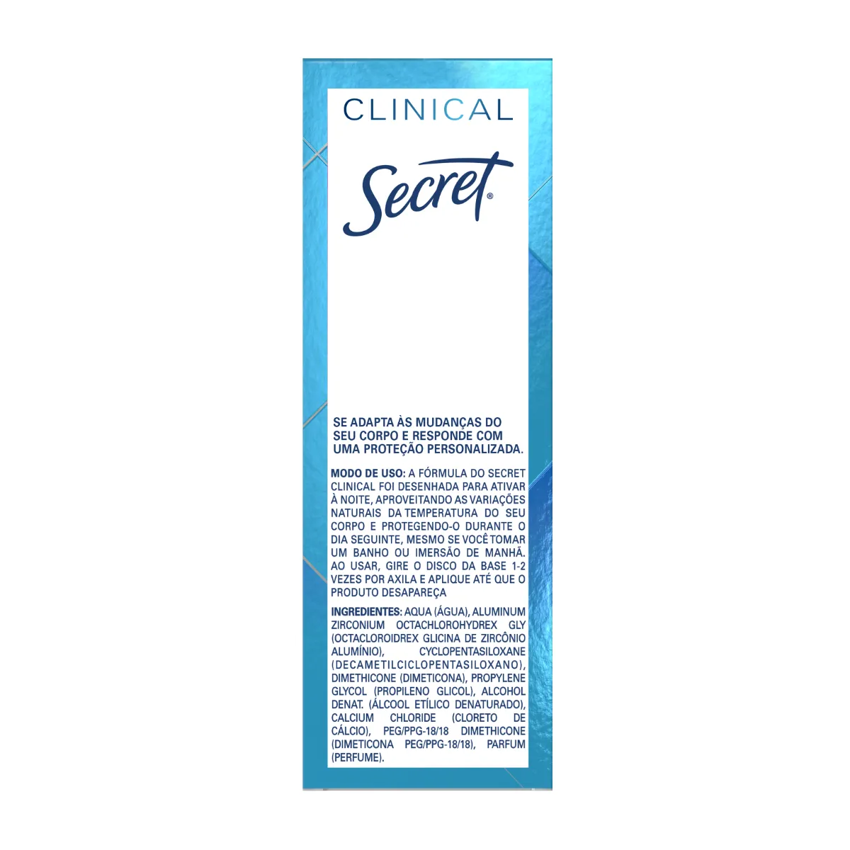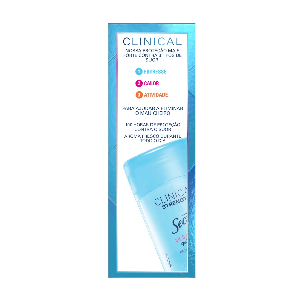 O Desodorante Antitranspirante Secret Clinical é um desodorante clínico em gel que oferece proteção potente contra suor e mau odor por até 100 horas. Desenvolvido para quem busca máxima eficácia, ele combate os três principais tipos de suor: estresse, calor e atividade física, mantendo as axilas protegidas, secas e perfumadas ao longo do dia.