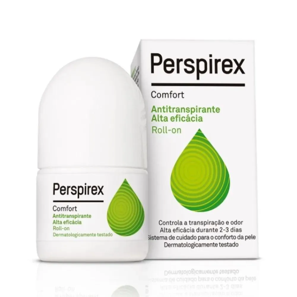 O Desodorante Antitranspirante Roll-on Perspirex Comfort é um antitranspirante de alta eficácia desenvolvido para controlar o odor e a transpiração excessiva. Com uma fórmula exclusiva, ele oferece proteção prolongada por até 2 a 3 dias, garantindo conforto e segurança na rotina diária. Sua apresentação em roll-on facilita a aplicação direta na região axilar, tornando o uso prático e eficiente. Além de combater o suor, o Perspirex Comfort incorpora um sistema de cuidado da pele, que hidrata e protege, proporcionando sensação de frescor e bem-estar. Dermatologicamente testado, é ideal para quem busca proteção intensa sem abrir mão do cuidado com a pele. O Desodorante Antitranspirante Roll-on Perspirex Comfort é indicado para pessoas que buscam controle intenso da transpiração e do odor nas axilas. Ideal para quem possui transpiração excessiva e procura uma solução eficiente, confortável e dermatologicamente segura para o dia a dia. Quais os benefícios do Desodorante Antitranspirante Roll-on Perspirex Comfort? - Controla eficazmente o odor e a transpiração excessiva; - Proporciona proteção prolongada por até 2 a 3 dias; - Contém sistema de cuidado que hidrata e protege a pele; - Dermatologicamente testado, minimizando riscos de irritação; - Apresentação roll-on para aplicação prática e precisa; - Indicado especialmente para a região das axilas; - Sensação de frescor e conforto durante todo o dia. Modo de uso: 1. Aplicar à noite na pele completamente seca e sem lesões. 2. Não há necessidade de reaplicar de manhã. Siga cuidadosamente as instruções explicativas do folheto de instruções do produto para obter todos os benefícios de Perspirex.