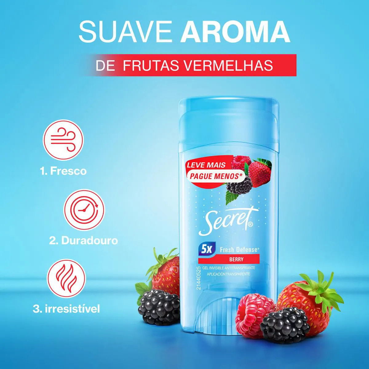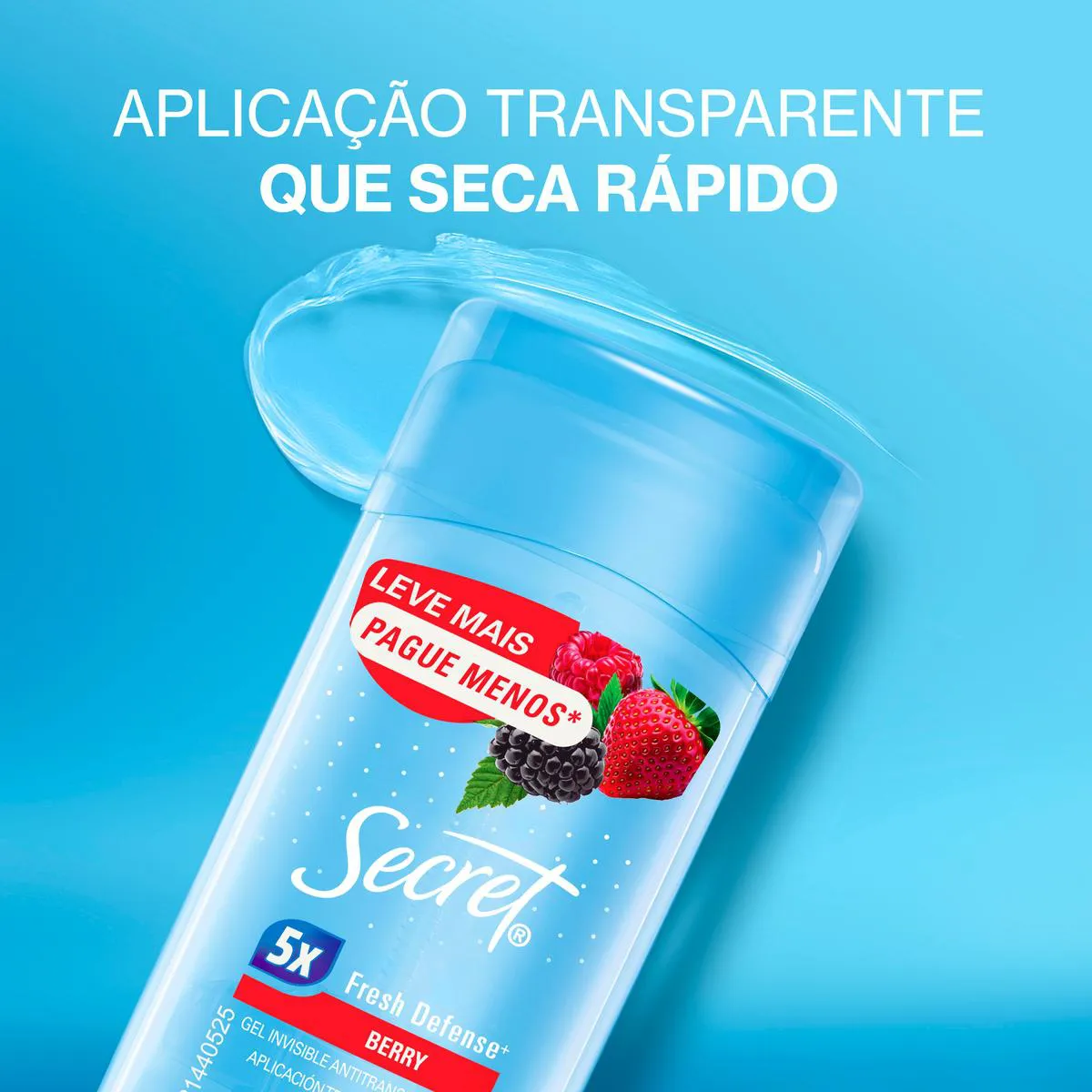 Secret em Gel Berry tem uma fragrância suave de frutas vermelhas e possui aplicação transparente, que oferece uma proteção superior contra o suor e o mau odor. É anti-manchas, não deixa manchas brancas na aplicação, além de contar com secagem rápida e um cheiro fantástico.