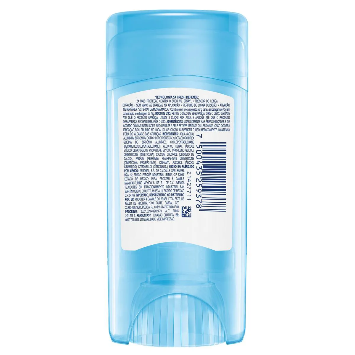 Aqua, Aluminum Zirconium Octachlorohydrex Gly, Cyclopentasiloxane, Alcohol Denat., Propylene Glycol, Dimethicone, Calcium Chloride, Parfum, PEG/PPG-18/18 Dimethicone, Cinnamyl Alcohol, Citronellol.