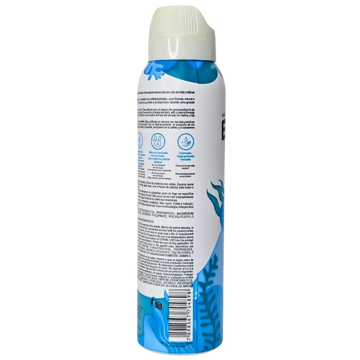 Composição: dimethyl ether, aqua, parfum, ethoxydiglycol, propanediol, magnesium hydroxide, magnesium carbonate hydroxide, distarch phosphate, polyglyceryl-3 caprylate, citric acid, silver citrate.