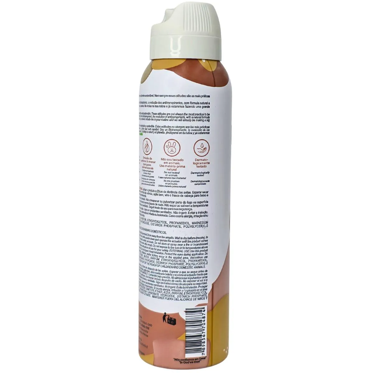Composição: dimethyl ether, aqua, parfum, ethoxydiglycol, propanediol, magnesium hydroxide, magnesium carbonate hydroxide, distarch phosphate, polyglyceryl-3 caprylate, citric acid, silver citrate.