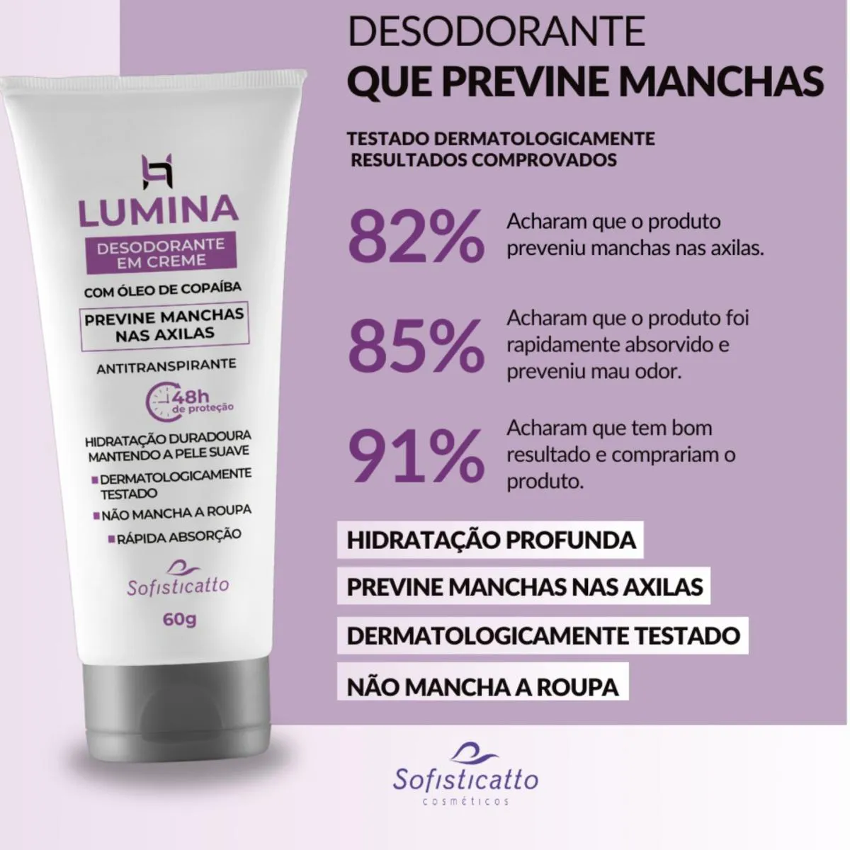 - Combate manchas em roupas e axilas.