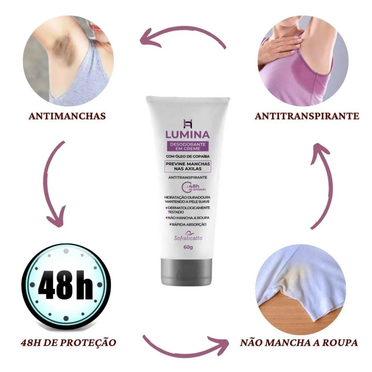 - Desodorante antimanchas com proteção por 48 horas.
