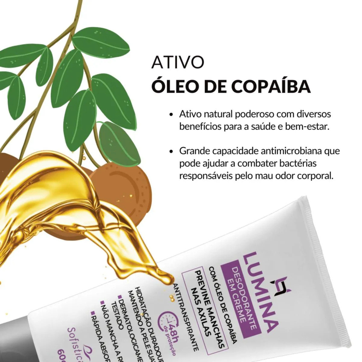 - Combate ao mau odor com ativo natural de Óleo de Copaíba com propriedades antimicrobianas.