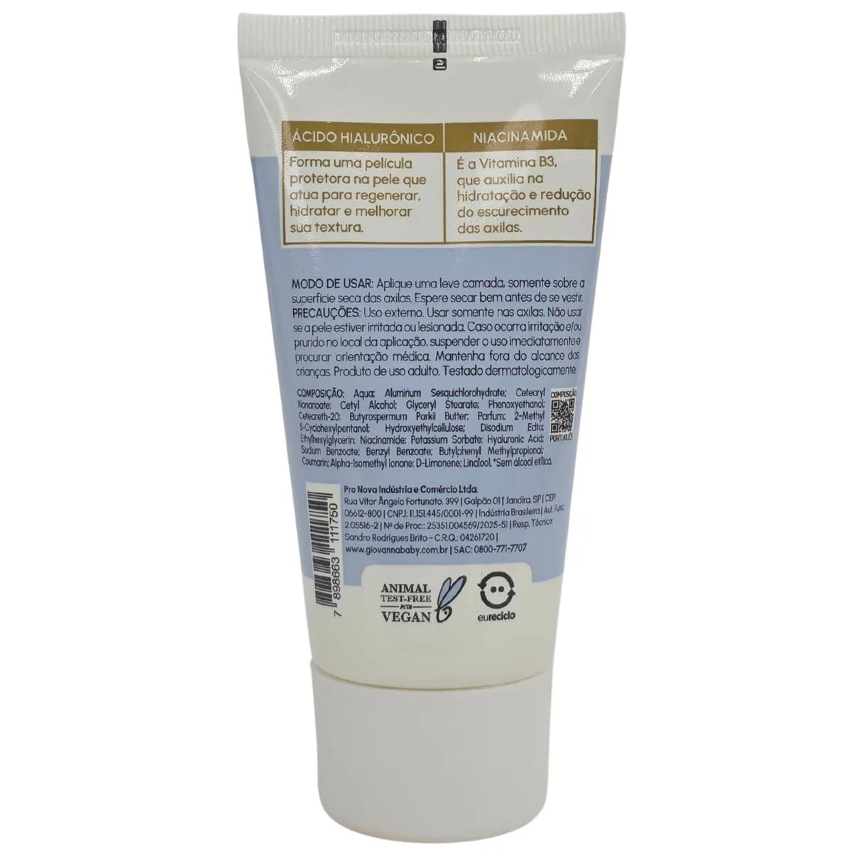 Finalidade: O Desodorante em Creme Bisnaga Giovanna Baby combina a eficácia de um desodorante tradicional com o poder hidratante de ativos como niacinamida, ácido hialurônico e manteiga de karité. Proporciona até 72 horas de proteção contra suor e odor, sem escurecer as axilas e sem deixar resíduos nas roupas. Sua fórmula cremosa e delicada hidrata profundamente a pele, oferecendo uma agradável sensação de conforto ao longo do dia. A embalagem em bisnaga é prática e higiênica, ideal para o uso no dia a dia e perfeita para levar na bolsa ou na nécessaire.