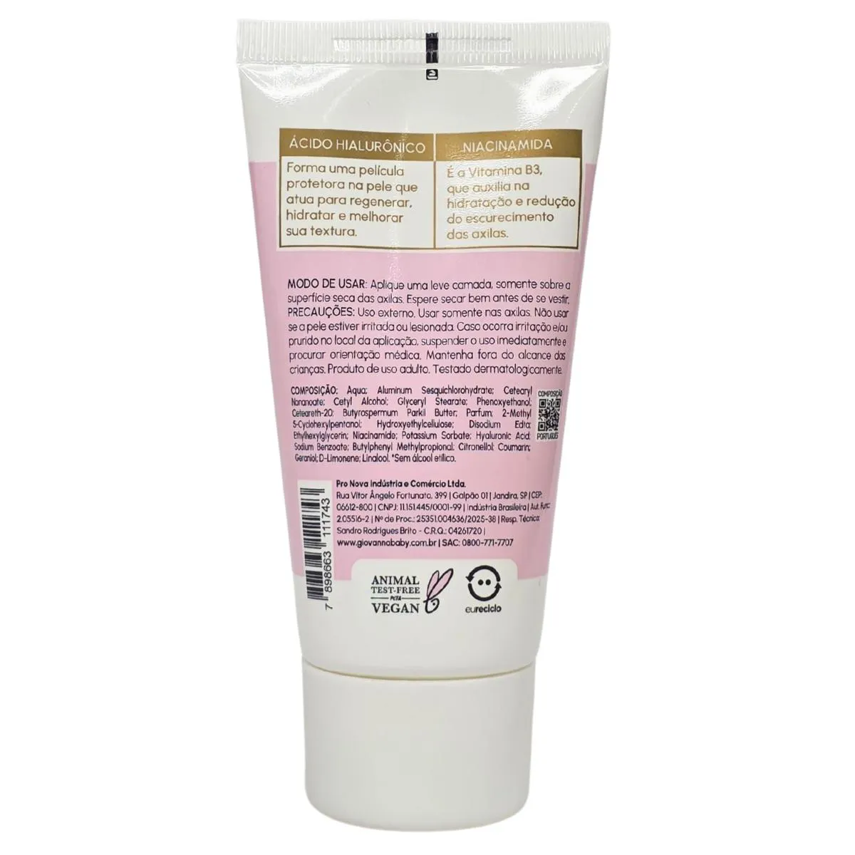 Finalidade: O Desodorante em Creme Bisnaga Giovanna Baby combina a eficácia de um desodorante tradicional com o poder hidratante de ativos como niacinamida, ácido hialurônico e manteiga de karité. Proporciona até 72 horas de proteção contra suor e odor, sem escurecer as axilas e sem deixar resíduos nas roupas. Sua fórmula cremosa e delicada hidrata profundamente a pele, oferecendo uma agradável sensação de conforto ao longo do dia. A embalagem em bisnaga é prática e higiênica, ideal para o uso no dia a dia e perfeita para levar na bolsa ou na nécessaire.