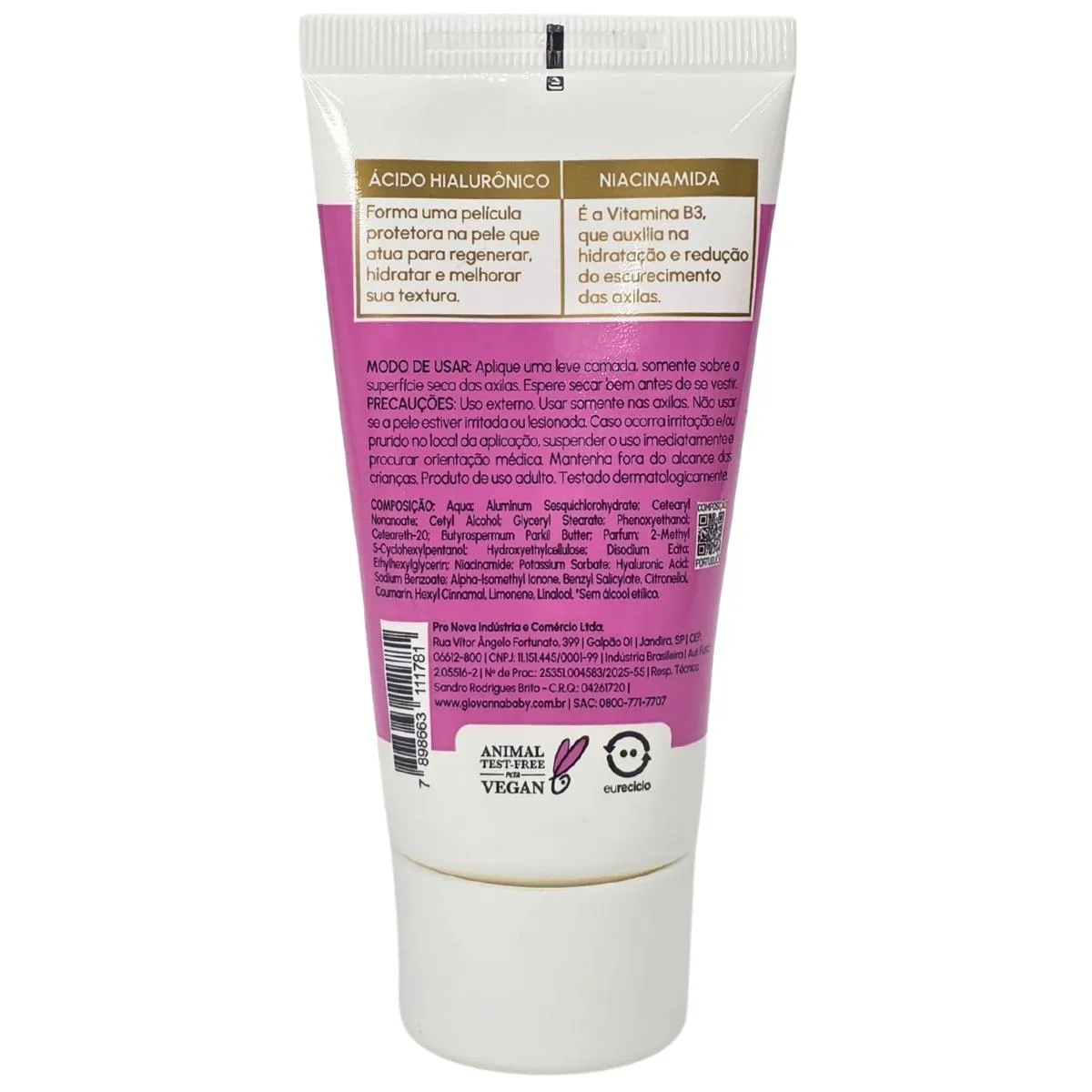 Finalidade: O Desodorante em Creme Bisnaga Giovanna Baby combina a eficácia de um desodorante tradicional com o poder hidratante de ativos como niacinamida, ácido hialurônico e manteiga de karité. Proporciona até 72 horas de proteção contra suor e odor, sem escurecer as axilas e sem deixar resíduos nas roupas. Sua fórmula cremosa e delicada hidrata profundamente a pele, oferecendo uma agradável sensação de conforto ao longo do dia. A embalagem em bisnaga é prática e higiênica, ideal para o uso no dia a dia e perfeita para levar na bolsa ou na nécessaire.