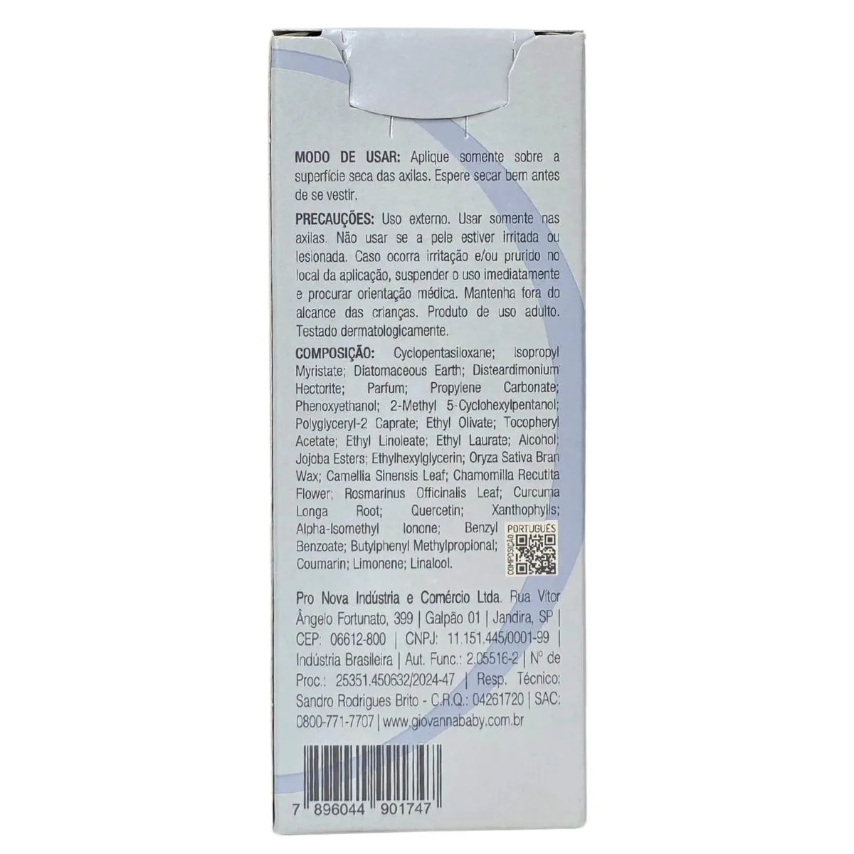 Finalidade: A fórmula exclusiva 0% Alumínio, Parabenos e Triclosan Giovana Baby possui alta performance, que garante o controle da transpiração e do odor de forma segura, promovendo conforto, cuidado e bem-estar por até 48 horas.