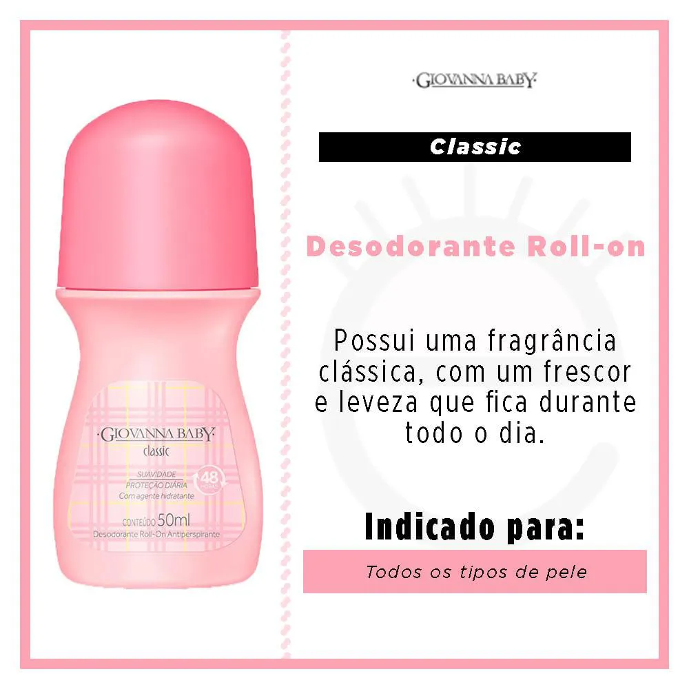 O desodorante roll-on feminino Classic é feito para mulheres delicadas e clássica, que não abre mão de uma boa fragrância para enfrentar o dia a dia. Toda a delicadeza e doçura dentro do frasco de Giovanna Baby.
