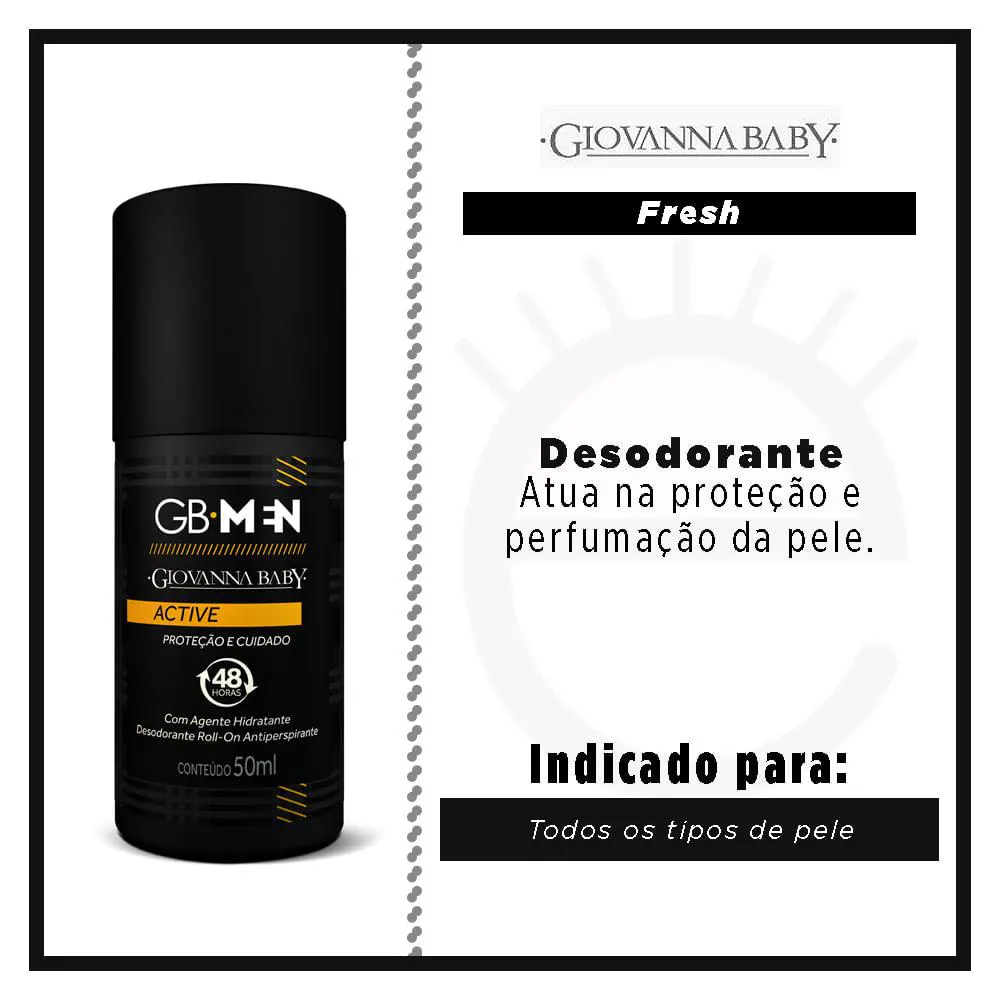 O Desodorante Roll-On GB Men Active foi especialmente formulado com ingredientes que atuam para proteção e perfumação da pele. A combinação das notas amadeiradas, florais e almiscaradas tem como resultado uma fragrância envolvente, que traz sensação de bem estar e conforto. Para homens esportistas e de espirito livre.