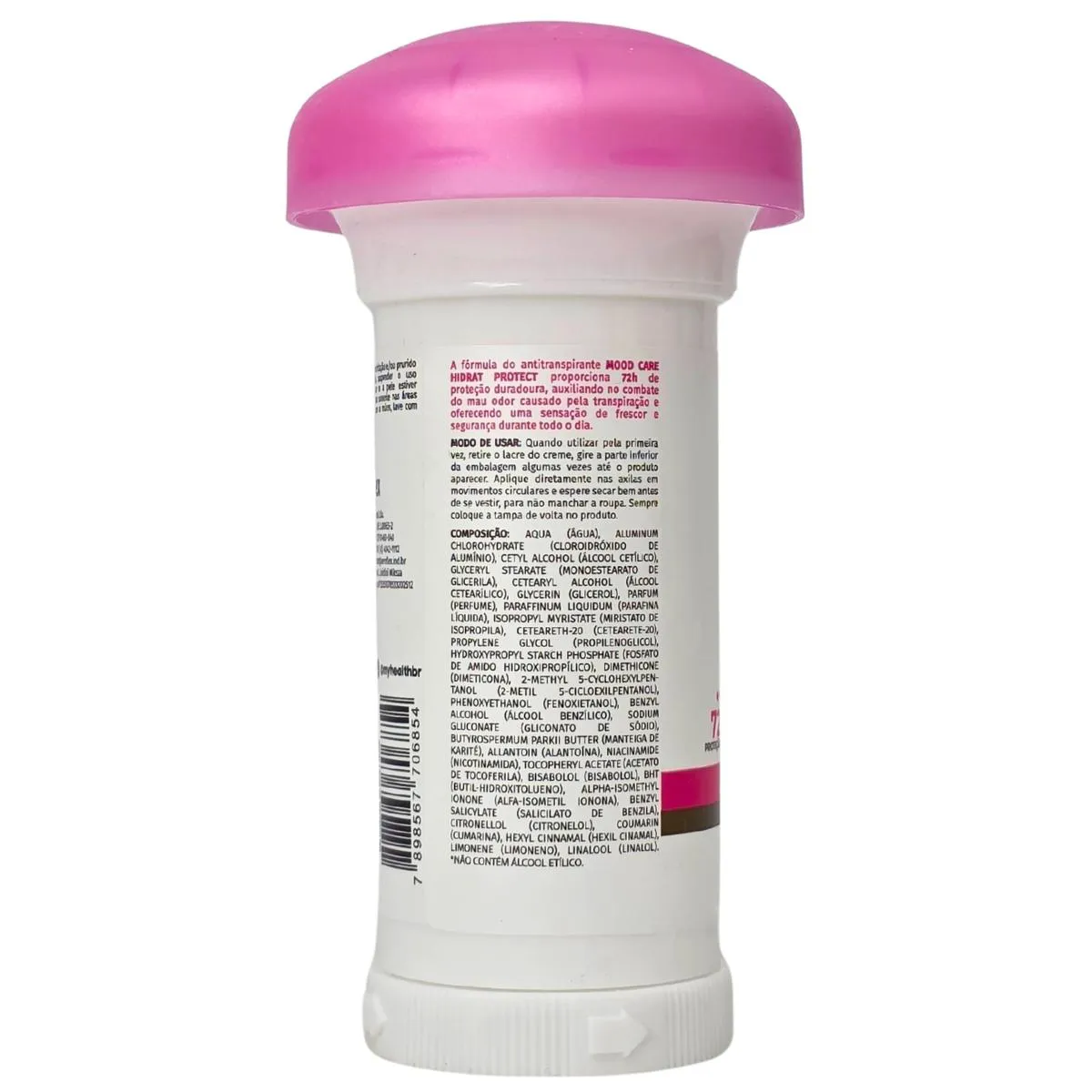 Finalidade: A fórmula do antitranspirante Hidrat Protect Mood Care proporciona 72h de proteção duradoura, auxiliando no combate do mau odor causado pela transpiração e oferecendo uma sensação de frescor e segurança durante todo o dia.
