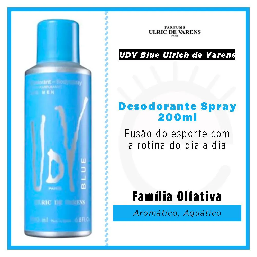 A fusão do esporte com a rotina do dia a dia estão presentes em uma fragrância ideal para todos os momentos. Para homens modernos, dinâmicos e sedutores. O desodorante masculino Blue de Ulrich De Varens possui em suas notas de cabeça combinam lavanda, limão e notas verdes; jasmim, muguet e cardamomo são as notas de coração; como nota de fundo temos madeira de sândalo, cedro e almíscar.
