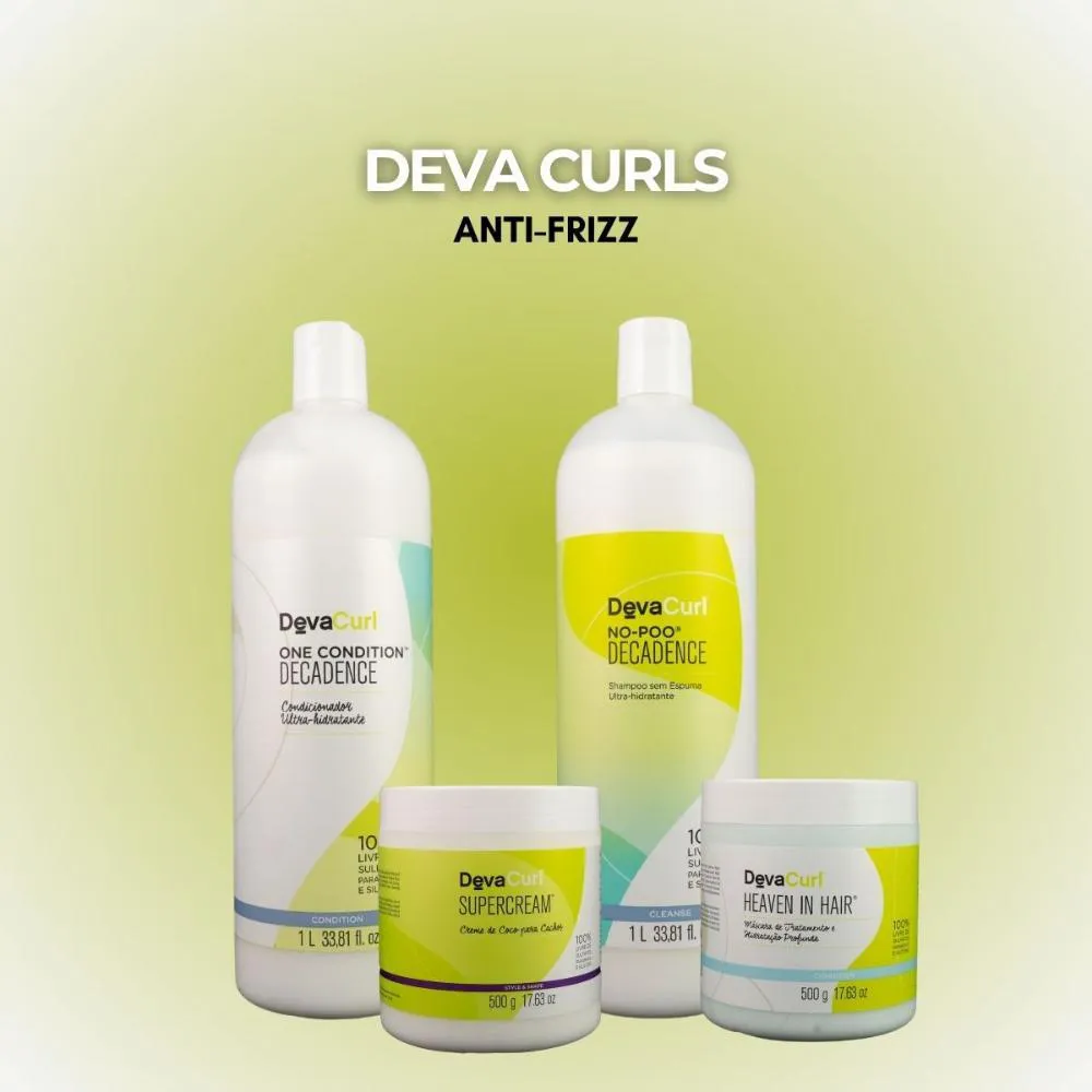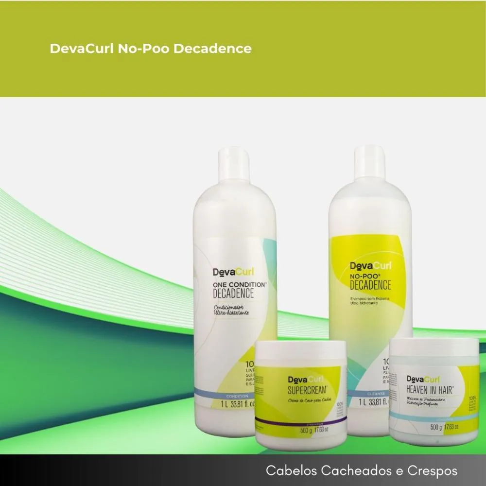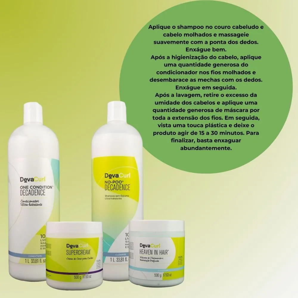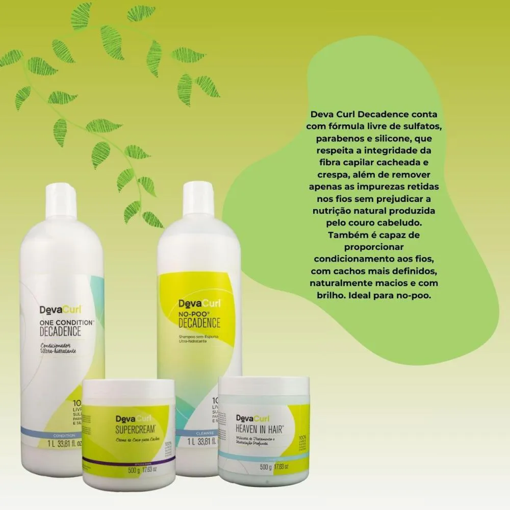 01 Unidade DevaCurl No-Poo Decadence Shampoo Ultra-hidratante 1L 01 Unidade Deva Curl One Condition Decadence Condicionador 1L 01 Unidade Deva Curl Heaven in Hair Máscara de Hidratação 500g 01 Unidade Deva Curl Supercream 2 Creme de Coco para Cachos 500g