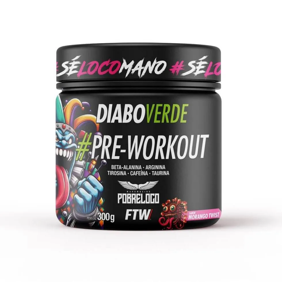Diabo Verde Insano Pre-Workout (300g) - FTW Sports NutritonSeu treino muito mais insano! Deixe seu treino insano com um poderoso pré-workout com 200mg de cafeína. Em sua composição encontramos aminoácidos não essenciais como a alanina, a arginina e a taurina. Além de sua base, duas substâncias potentes: a cafeína, que auxilia no aumento da performance no desempenho de exercícios físicos de resistência. Compre com garantia de qualidade direto da fábrica. O que é o Diabo Verde Insano FTW? Cada substância escolhida para o Diabo Verde Insano FTW, foi pensada exclusivamente para o melhor desempenho das vias metabólicas do nosso organismo. Diabo Verde Insano FTW é a combinação perfeita para o seu treino!Como tomar o Diabo Verde Insano FTW? A melhor maneira de como consumir o Diabo Verde Insano FTW dependerá de cada caso. Por isso, é necessário consultar um profissional da saúde para acrescentar esse produto em sua rotina. Dessa forma irá depender da demanda do organismo de cada um. De qualquer forma em nossa embalagem recomendamos diluir 10g (2 medidas dosadoras) em 1 copo contendo 200ml de água gelada ou suco de preferência. Benefícios:* Força e Disposição para treinos mais duradouros;* Maior vasodilatação dos vasos sanguíneos; * Acelera o crescimento muscular;* Aumento prolongado da energia;