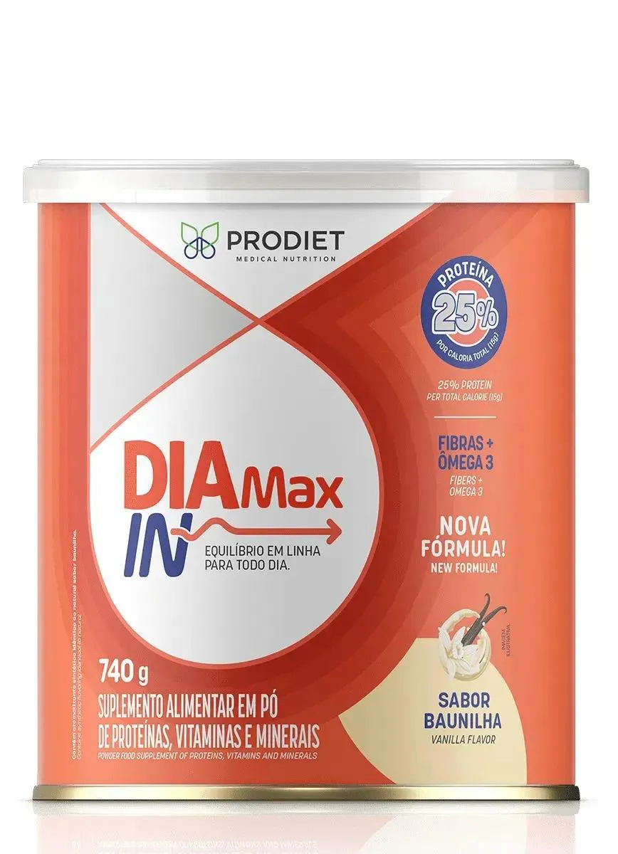 Suplemento alimentar em pó com proteínas, vitaminas e minerais para suporte nutricional diário. DiaMax IN Baunilha - Lata 740 gr O Diamax In Baunilha é um suplemento alimentar em pó desenvolvido para auxiliar na complementação nutricional de adultos. Sua fórmula contém proteínas de alto valor biológico, carboidratos, fibras, vitaminas e minerais que contribuem para a manutenção da energia, suporte nutricional e equilíbrio da alimentação diária. Possui sabor baunilha agradável e pode ser consumido entre refeições ou adicionado a preparações diversas. Aplicação e uso Adicionar a quantidade recomendada do produto em água, leite ou bebida de preferência, misturando até completa dissolução. Também pode ser consumido em preparações como: vitaminas sucos mingaus sobremesas receitas diversas Consumir conforme orientação de profissional de saúde ou nutricionista.