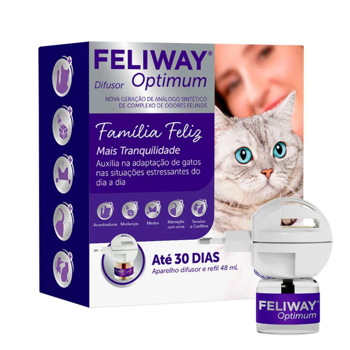 A mais recente inovação no campo dos feromônios felinos, o Feliway Optimum, apresenta um complexo sintético avançado de odores felinos. Este novo composto transmite mensagens tranquilizantes que ajudam os gatos a se adaptarem a situações estressantes do dia a dia. Para um efeito contínuo e ideal, recomenda-se manter o difusor conectado o tempo todo, trocar o refil mensalmente e substituir o difusor a cada seis meses.