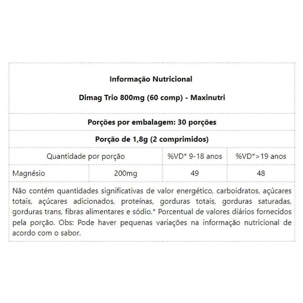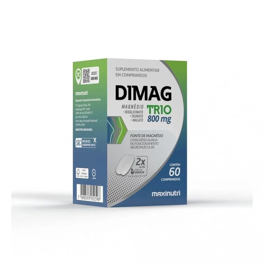 Dimag Trio 800mg (60 comp) O magnésio é o mineral mais abundante do corpo humano e é encontrado principalmente nos ossos, músculos e outros tecidos. Estima-se que seja necessário para mais de 300 reações bioquímicas no organismo. Para ter qualidade de vida, é preciso consumir magnésio em quantidades suficientes, seja através da alimentação, suplementação ou ambas. Dimag Trio 800mg é um suplemento alimentar que combina Bisglicinato de Magnésio, Taurato de Magnésio e Malato de Magnésio. Benefícios: - Auxilia na formação de ossos e dentes;- Auxilia no funcionamento muscular;- Auxilia no metabolismo energético;- Auxilia no funcionamento neuromuscular.