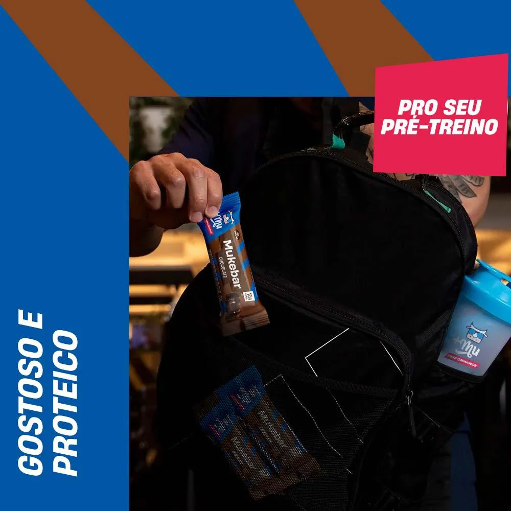 Se liga na Mukebar Sabor Chocolate, a nossa barrinha proteica ideal pro seu pós-treino! Ela possui 15g de proteína, não tem adição de açúcares, nem textura de borracha e é super macia!