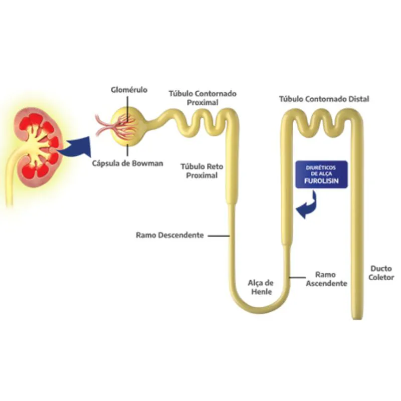 O Diurético Furolisin 10mg Vetnil é uma medicação que auxilia na reabsorção passiva de água indicado para cachorros e gatos. Sua principal ação é no segmento ascendente da alça de Henle. A furosemida inibe a reabsorção de sódio, potássio e cloreto na porção espessa da alça de Henle, levando à diurese.